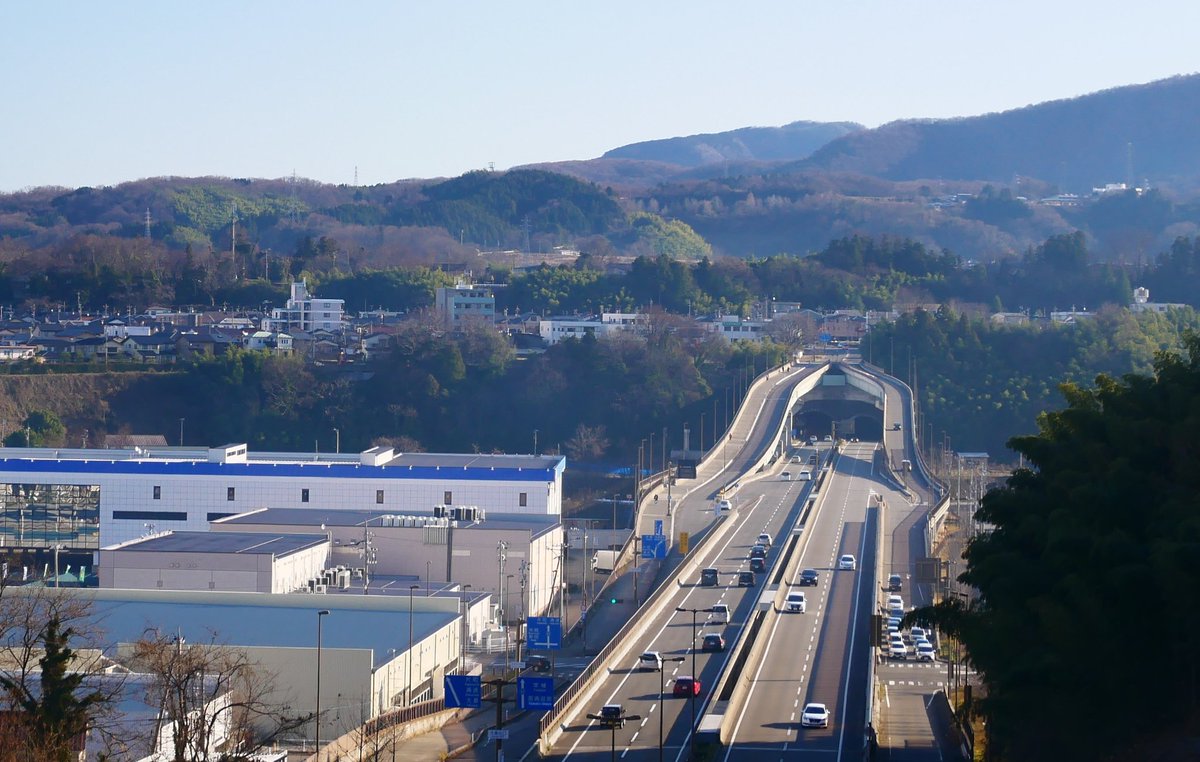 いつも通ってるけどこうなってたんだ。向こうのほう(西)は、阪神高速東大阪線が上、近鉄けいはんな線が下。阪神高速が左右に分かれて上り口と下り口、ここから以東は第二阪奈道路。真ん中から近鉄出て来て新石切駅。駅の下では第二阪奈は阪奈トンネルに突入、ちょっと遅れて近鉄生駒線もトンネルへ。