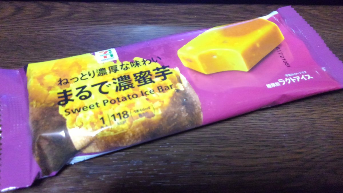 さつまいも好きはセブンへGO!セブンのまるでシリーズ新作が完全に密芋!濃厚&ねっとり食感のスイートポテトアイスの中にはダイスカットした薄皮付のさつまいもをゴロリと贅沢に使用!芋感ハンパないアイスバー!セブンプレミアム『まるで濃密芋』