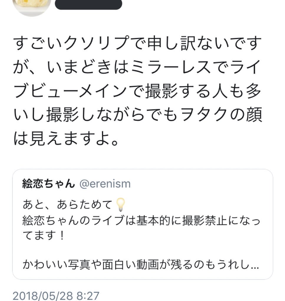 2018.05.28 ツイート maru月曜の朝からめっちゃ笑っちゃったからクソリプおじさんは世の中に必要 すけ @じゅん1@kangfoo4月曜の朝からめっちゃ笑っちゃったからクソリプおじさんは世の中に必要 10:29 – 2018年05月28日返信リツイートお気に入り ツイートに対するネットの反応Yoshiki MORI@luke_moriワロタwww23:11 – 2018年05月28日返信リツイートお気に入りhapeco@hapecoRT @rongtail: クソリプおじさん、いい仕事したwww22:35 – 2018年05月28日返信リツイートお気に入りらんぶる なますテ@Ramble_FXワロタwww22:16 – 2018年05月28日返信リツイートお気に入りむりょく茶@nm_1c_ur普通に3枚目のツイートをRTするだけでみんな察してくれると思うんですけどね(^_^;)22:13 – 2018年05月28日返信リツイートお気に入り崎山圭@sakiyamaK最高21:06 – 2018年05月28日返信リツイートお気に入り監督解任3秒前@genin3byoumae絵恋ちゃんwww( つ∀ ` )素出し過ぎワロタwwwスゴイ丁重にクソリプ送ってるのにwww20:57 – 2018年05月28日返信リツイートお気に入りタクヲ@taxo876リアルしゅがはっぽくて萌え20:38 – 2018年05月28日返信リツイートお気に入り缶バッヂ屋DD✋Waiting for YUI❌5/22ー23ももクロ@桃響導夢@kan_badge_ya( ゚∀゚)・∵ブハッ!! いいね〜この子♪19:25 – 2018年05月28日返信リツイートお気に入りsukllmurphy@sukllmurphyウケるなー(笑18:54 – 2018年05月28日返信リツイートお気に入りKenta.three@Kenta_three・・・!!!wwwwwww(1分近く笑い死んでたw)18:50 – 2018年05月28日返信リツイートお気に入りザム@44YSH44草18:11 – 2018年05月28日返信リツイートお気に入りSoroscut(LC4300万)往復ビンタ食らってPC壊れて更にやる気なし@JeorgeSorosこういうやり取りを「賭ケグルイ」で見ました…17:57 – 2018年05月28日返信リツイートお気に入りろんぐて〜る【全部売れ協会】@rongtailクソリプおじさん、いい仕事したwww17:54 – 2018年05月28日返信リツイートお気に入りちゃとらねこ@yuiskybeanschat頑張れ!つか頑張ってる!絵恋さん。大変だな。17:52 – 2018年05月28日返信リツイートお気に入り龍ノ魁心(空も飛べるはず)@HotheartTake途中豹変こえ~(;´Д`)ノ17:40 – 2018年05月28日返信リツイートお気に入り雷丸@Ikazuchi_maruRT @yasuyukima: 本音が素晴らしい。17:38 – 2018年05月28日返信リツイートお気に入りやすゆき@しばらく日本です。@yasuyukima本音が素晴らしい。17:36 – 2018年05月28日返信リツイートお気に入り⸌⍤⃝⸍ 道産子摩周⸌⍤⃝⸍@i_si_kari_pet酒は元々の本性がかいまみえる くそりぷおじさんも同じ作用がある17:28 – 2018年05月28日返信リツイートお気に入りKAC@cosame1025日本って平和!17:18 – 2018年05月28日返信リツイートお気に入りグイード・ミスタ@m7053544886さすが絵恋ちゃん ちなワイの描いた似顔絵が絵恋ちゃんのCDにの歌詞カード?にのってるはず(買ってないからわからんけど)16:52 – 2018年05月28日返信リツイートお気に入りARI2@ARI2_この切り捨て感すこ14:43 – 2018年05月28日返信リツイートお気に入りどうでしょう@suiyoudoudesuka流石の対応w13:27 – 2018年05月28日返信リツイートお気に入りはく@pad89_hakuやっべwwwwww13:19 – 2018年05月28日返信リツイートお気に入りヒデ(RNバツイチ)@hidebon45やっぱりカリスマだなぁ。13:13 – 2018年05月28日返信リツイートお気に入りさかもと、@camera__boy絵恋ちゃん切れ味凄すぎて即フォローした13:13 – 2018年05月28日返信リツイートお気に入り澤田幸雄/さわちゃん@rock1977ネタ的なやりとりとしては面白いけど、単純に、文章の内容や、意図を読み取れない人が増えているというニュースと関連は無いのかしら。意図を分かった上で、無視してるのが面白いでしょ?という人もいるでしょうけどね。(^_^)13:07 – 2018年05月28日返信リツイートお気に入り