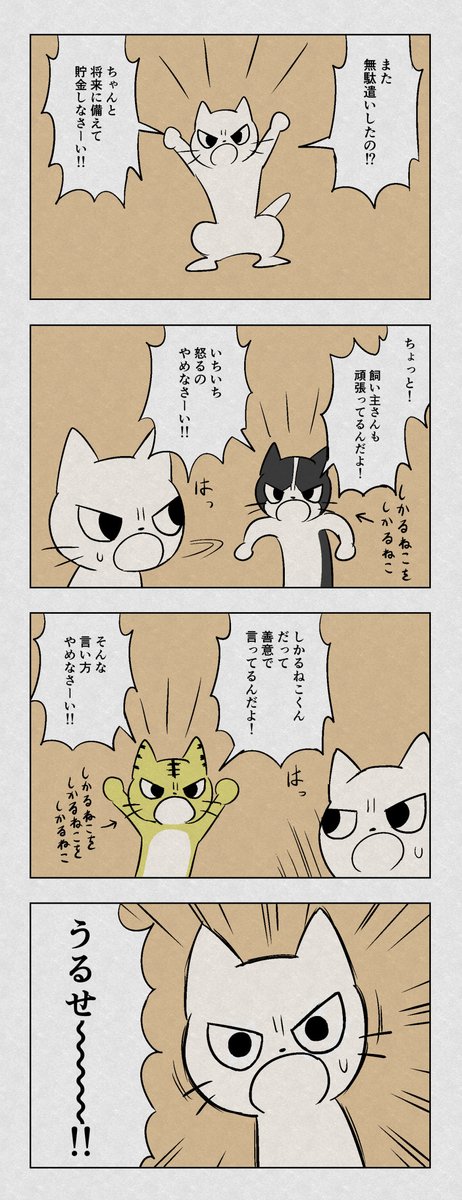 4コマ目の穴埋め大喜利やりたいけど、しかるねこの作者さんと、しかるねこをしかるねこの作者さんと、しかるねこをしかるねこをしかるねこの作者さんに許可取らなくちゃいかんからな・・・。