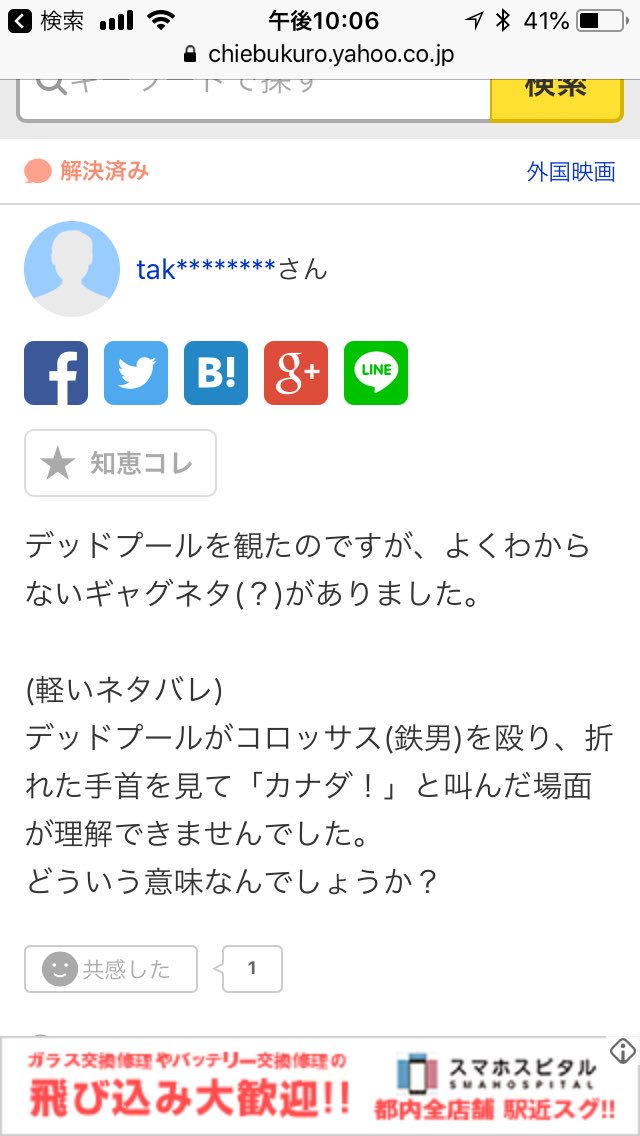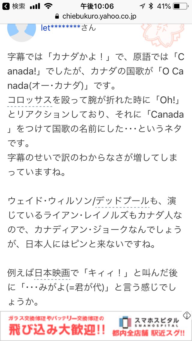 昨日友達とデッドプール1みたんだけど、デップーがカナダかよ!(字幕版)と叫ぶシーンで??となったらしく調べてみたら私もぜんぜん知らないネタ出て来てバカ笑ったwwwwそうだったんだwwwwwwwキィィ!!みがよwwwwwwwwwwww