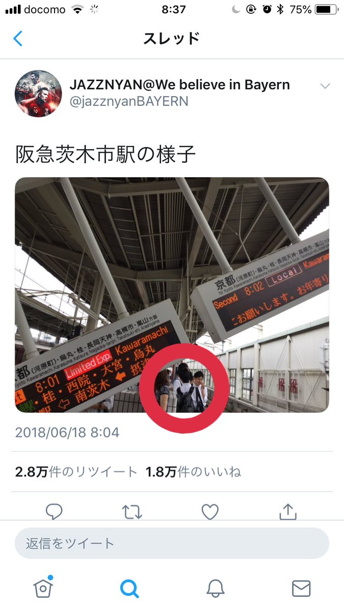 2018.06.18 ツイート maru一気に身バレするの草 べいたん@Iari0a一気に身バレするの草 08:40 – 2018年06月18日返信リツイートお気に入り ツイートに対するネットの反応くじらちゃん@kuj_ra_sZこのツイートに身バレがデマとか意味わからんこと言ってる奴いるけど、本人を見るんじゃなくて、周りの人間とか電光掲示板の時間とか行き先の文字とかそこまでみればすぐに気づくだろ17:38 – 2018年06月18日返信リツイートお気に入り0x0000@spectre0xワンピースのおばさんの方が身バレ感ある15:21 – 2018年06月18日返信リツイートお気に入り耕作員になります@takumi_nkhr3枚目と4枚目の人明らかに違くね?14:37 – 2018年06月18日返信リツイートお気に入りあぽ➕✖@apochaan_全然違う人で草12:55 – 2018年06月18日返信リツイートお気に入りアンデルくん亜種来るまで課金しません@Alice_0117_これ本人が自分じゃないと否定してるって聞いたんだけど…?12:49 – 2018年06月18日返信リツイートお気に入り水無瀬流@ryu_minase本人否定してるのにRTされまくっててかわいそう11:38 – 2018年06月18日返信リツイートお気に入りKngOzk@KngOzk1ダイナミック身バレ10:24 – 2018年06月18日返信リツイートお気に入りラスロス@valfe002grenze1ワロタ10:05 – 2018年06月18日返信リツイートお気に入り塊素@wwkaisoあれ、この駅にいるんだけど、見逃した! 反対側のホームか。こっちは大阪行きだったからなぁ、見たかった。09:45 – 2018年06月18日返信リツイートお気に入りにゃんぽんNIRO@nya3nyanpon日本人の余裕感…08:47 – 2018年06月18日返信リツイートお気に入りぷ~さん@popolili14地元近い!08:44 – 2018年06月18日返信リツイートお気に入り