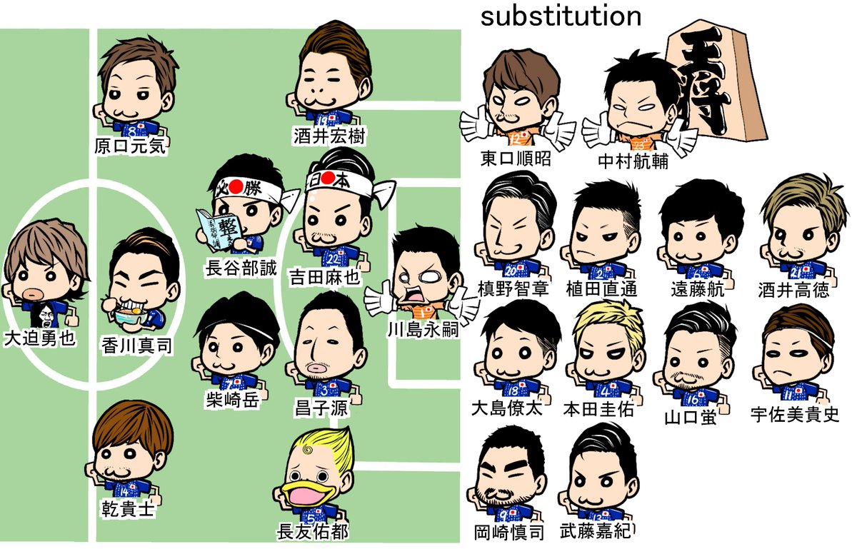 2018.06.19 ツイート maru日本 コロンビア戦スタメン。#日本代表 #JPN #SAMURAIBLUE #COL #サッカーキング #jfa #da… 千田純生@chidajunsei3163日本 コロンビア戦スタメン#日本代表 #JPN #SAMURAIBLUE #COL #サッカーキング #jfa #daihyo#WorldCup20:10 – 2018年06月19日返信リツイートお気に入り ツイートに対するネットの反応三千院@SanzeninPRT @raikumakoto: いい画像リプしてもらった。05:51 – 2018年06月20日返信リツイートお気に入りITALY@FORBLUEキャンチョメ(笑)05:18 – 2018年06月20日返信リツイートお気に入りかおるん♡@hitujimusumeきゃんちょめwwwwww03:20 – 2018年06月20日返信リツイートお気に入りふーが@t0fucheいつの間にか長友が完全にキャンチョメ化してた 可愛い笑笑03:06 – 2018年06月20日返信リツイートお気に入りぼりん@boribori_Gここ最近で一番大好きな画像#金色のガッシュベル #サッカー日本代表01:34 – 2018年06月20日返信リツイートお気に入り掛上 真亘@manato_k320いや、長友笑笑 意外と似てるやんけ笑笑01:32 – 2018年06月20日返信リツイートお気に入り優@iiyu23長友wwwwwwwwwwwwwwwww01:32 – 2018年06月20日返信リツイートお気に入り聖@hijirin18長友wwwwww00:45 – 2018年06月20日返信リツイートお気に入り[yoshiki]@@yoshiki400R大迫のユニと、アモーレwww00:36 – 2018年06月20日返信リツイートお気に入りぺい太郎@篠宮・元気太郎@peitarousolくっそwww長友wwwwwwwww00:32 – 2018年06月20日返信リツイートお気に入りもっち@motch1219これ、可愛すぎ⚽️ #W杯 #ワールドカップ #日本代表 #コロンビア00:23 – 2018年06月20日返信リツイートお気に入り音浦ノッキー@otonokiurajyoあっあれwww長友www 整さんもおうどんさんもお顔が!w00:09 – 2018年06月20日返信リツイートお気に入り龍也(=リュウヤ)ꉂ (๑¯ਊ¯)イコlove✨@rotenburug仁杉00:05 – 2018年06月20日返信リツイートお気に入りT∀izo@soocoormfskami大迫はじめしゃちょーにしか見えやんし 長友おもろい00:05 – 2018年06月20日返信リツイートお気に入りHARASAWA@_hrsw長友キャンチョメwwwwwwwwwwww23:50 – 2018年06月19日返信リツイートお気に入り