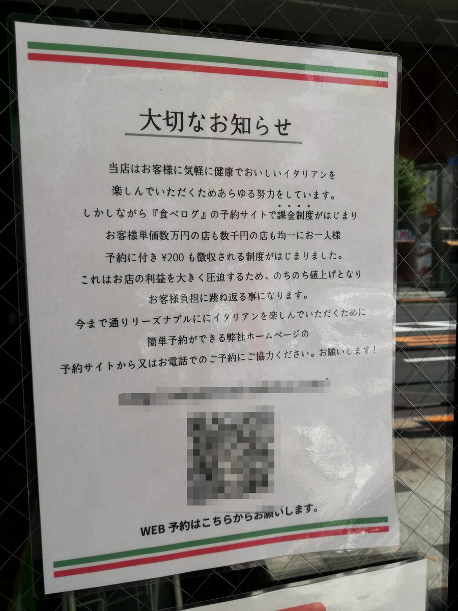 食べログというサイトに自分のレストランを掲載し、そこから予約できるシステムを利用しておきながらこの文言は酷いな。食べログが悪者みたいに書いてるけど食べログから予約する人の大半は食べログがなけりゃその店を見つけないし予約もしないんだよ。システム使ったらお金支払うって普通じゃない。