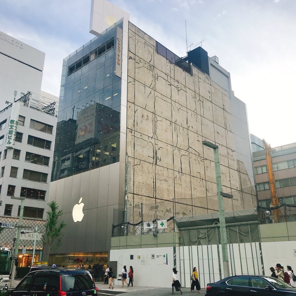 壁面はコンクリ打ちっ放しのAppleストア、江戸東京たてもの園で展示されてる関東震災後に流行った看板建築(前だけ銅張りの洋風、壁は木造で和風)の再来のようで趣がある