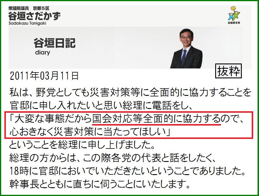 その後も、谷垣自民党総裁は、与党として災害を経験した様々なノウハウを惜しみなく民主党政権に伝えようとしていましたが、器の小さい民主党政権はそれを拒否していました。