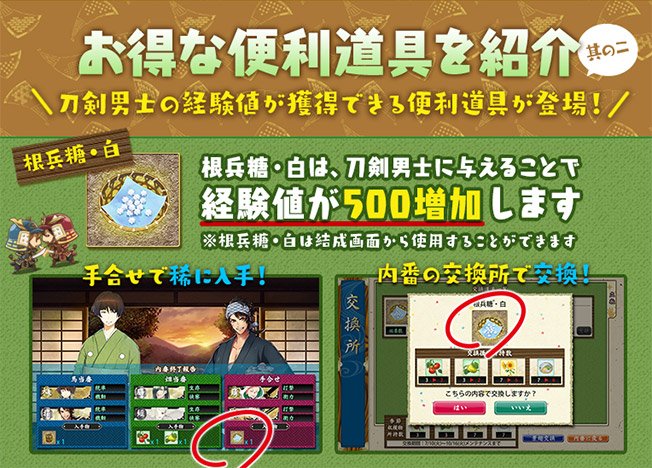 2018.07.10 ツイート maru(5/8) 【根兵糖(こんぺいとう)・白について】 根兵糖・白は、刀剣男士に与えることで、経験値を500増加させる新しい便利道具… 刀剣乱舞-ONLINE-【運営】@TOUKEN_STAFF(5/8) 【根兵糖(こんぺいとう)・白について】 根兵糖・白は、刀剣男士に与えることで、経験値を500増加させる新しい便利道具です。 内番・手合せで稀に獲得できるほか、交換所で季節の収穫物との交換によって入手できます。 ※Lv99の刀剣男士には使用できません。 #刀剣乱舞 #とうらぶ19:04 – 2018年07月10日返信リツイートお気に入り ツイートに対するネットの反応ネタ帳@ddd_plus死ぬほど便利じゃん?!!!20:00 – 2018年07月10日返信リツイートお気に入りみれいーゆ@mirei_pero経験値アップアイテム…?19:57 – 2018年07月10日返信リツイートお気に入りなつ@sweetchain0322RT @toukenkouryaku: 待望の経験値増加アイテム19:55 – 2018年07月10日返信リツイートお気に入りはるひ@april4teaワッショイ└(゚∀゚└) (┘゚∀゚)┘19:46 – 2018年07月10日返信リツイートお気に入りユーシェ@fgo_yusheへ??19:24 – 2018年07月10日返信リツイートお気に入りもちんばBot@MOTIMOTInba_Botぷゃ(白以外も気になるようです)19:18 – 2018年07月10日返信リツイートお気に入りちゃろきち@poodle0619ついに来た!!19:17 – 2018年07月10日返信リツイートお気に入り雨宮零@7/14昼夜 1789観劇(*´∀`)@kiku214!!?Σ(゚ロ゚;)19:14 – 2018年07月10日返信リツイートお気に入り蒼@歌仙極!!!@ao7863ついにとうらぶに ふしぎなアメが実装されてしまった19:14 – 2018年07月10日返信リツイートお気に入りちより* まんばちゃん極待ってます@chiyori315これ、包丁くんを餌付けできるやん19:12 – 2018年07月10日返信リツイートお気に入りあいな@ainakururiごひゃく……?五億の間違いでなく……?19:11 – 2018年07月10日返信リツイートお気に入りけいちゃん@5TZAFIk5h3rb09xこここここれ!!!!! 包丁ちゃんに御褒美あげられるぅぅうう!! おかしあげれるうううううううう!!!すごい嬉しい!!!!!!!19:08 – 2018年07月10日返信リツイートお気に入りれんれん†┌┘墓└┐†@TheWorldWisdom運営ちゃんそれ極だと気体程度にしかならない19:07 – 2018年07月10日返信リツイートお気に入りつきねこ@砂糖菓子ロス(①w①=)@kanichan0529食べる経験値…それが『根兵糖』?19:07 – 2018年07月10日返信リツイートお気に入りケンケン(コス名:蘭 響波)まんばくん!!@rA4bFczcpoZfCtaとうとう極めの鬼畜なレベリングに救済が来た19:07 – 2018年07月10日返信リツイートお気に入りあかふんおじさん(桃糖)@akclap46107ふ し ぎ な あ め19:06 – 2018年07月10日返信リツイートお気に入り刀剣乱舞攻略速報 ※非公式サイトです@toukenkouryaku待望の経験値増加アイテム19:06 – 2018年07月10日返信リツイートお気に入りちーさぁん@絹ごしメンタル@chi_saan05金平糖ではないのか根兵糖なのなwwww←19:06 – 2018年07月10日返信リツイートお気に入りまおう。@maoumukonほう!?19:05 – 2018年07月10日返信リツイートお気に入り