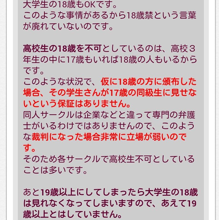 立場の弱さは同情するけれども、理由としては失当ではなかろうか。18歳が17歳に頒布するが如き行為は発行者の知った事ではないだろうし、注意書き等で言い訳ができそうな感じ。あと高校生という括りについては「いや、その注意書きが想定してるのって全日制課程ですよね?」って話でごぜえます。