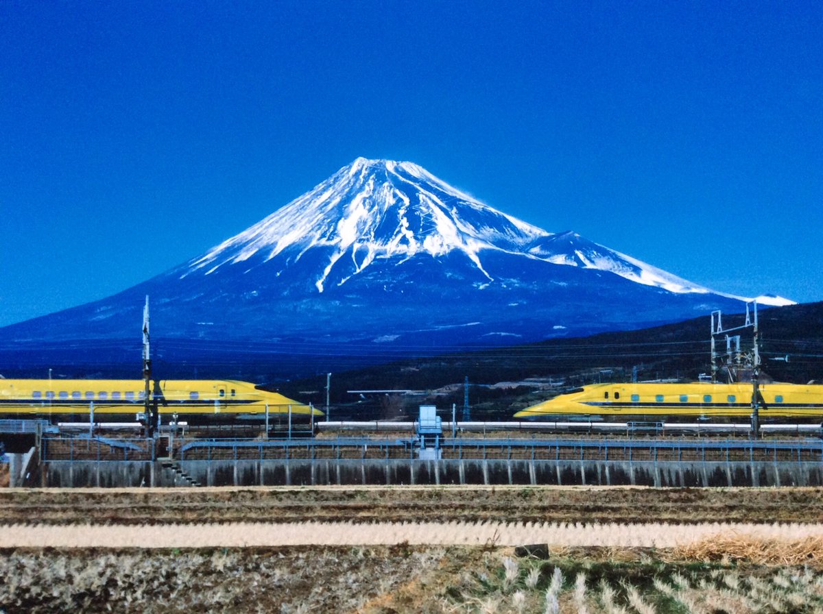 ドクターイエローの向い合せの写真です。 バッチリ富士山と一緒です。