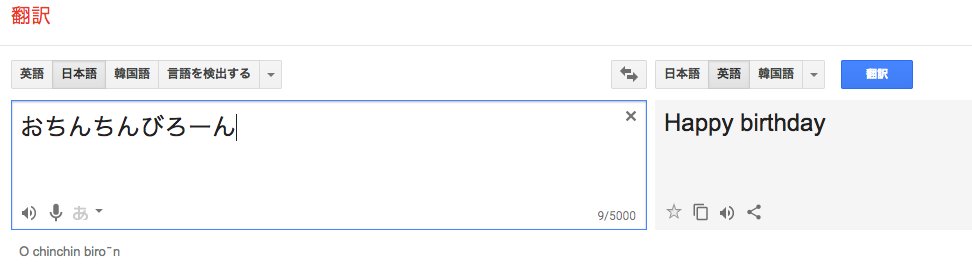 たぶん「ちんちん」が「乾杯」的な意味でとらえられて「びろ~んに乾杯」だとまだ中途半端だから余ったびろ~んの最初の3文字birから連想して「誕生日」と訳されて「誕生日に乾杯」→「Happy birthday」となる(適当