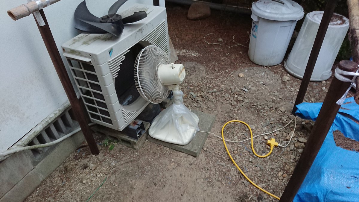 (^o^)「エアコン室外機壊れた。冷却ファンが焼損しとるけどコンプレッサー周りは生きてる。せや代わりに扇風機で風当てたろ」→壊れる前よりよく冷え・29度設定で寒いレベルに。