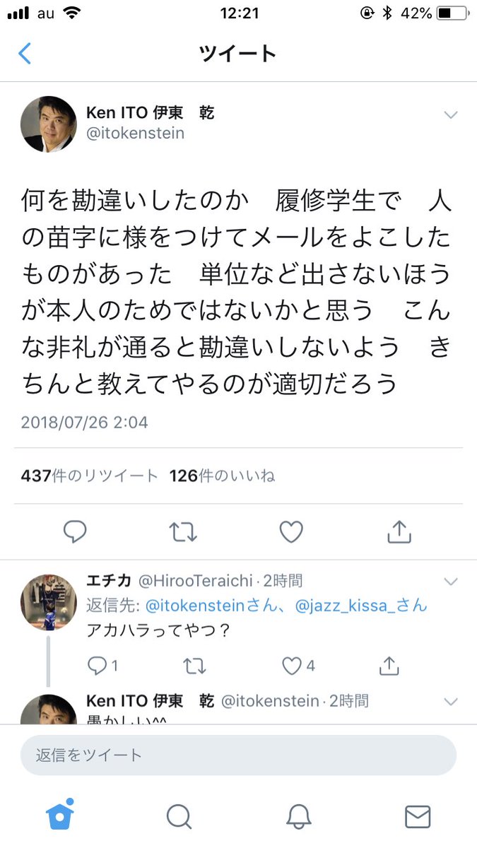 いやまあ学生が教員に対しては「先生」づけが当たり前であるしぶら下げてるツイートの画像引用は多分研究者同士の間でのことだろうが、ともあれ言葉のおかしい学生には単位を落とすのでなく丁寧に諭すのが後々のためになることだし、なぜ句読点を使わないのかかなり謎。