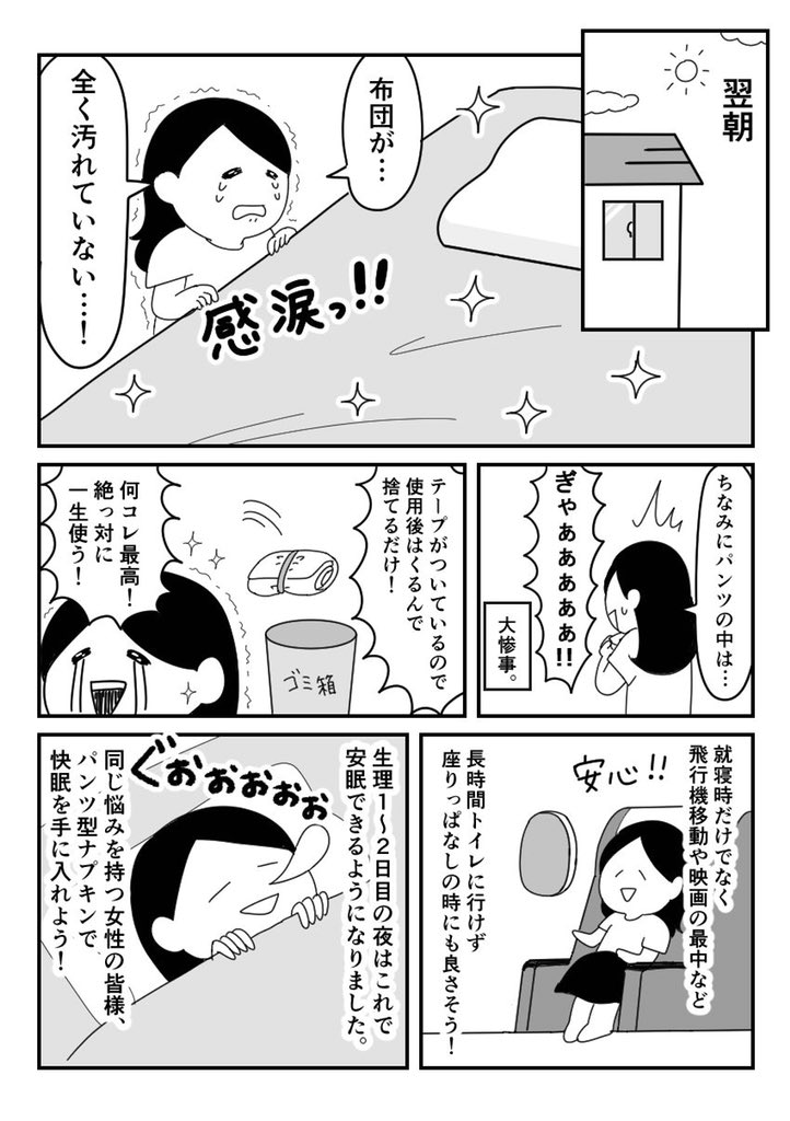 すごく余計なお世話かもしれないのだが、この方婦人科などは受診されていらっしゃるのだろうか…完全専門外ですが夜だけとはいえパンツ型ナプキンが必要なほど経血が多いのは経血量自体が多すぎるのではないかと心配…