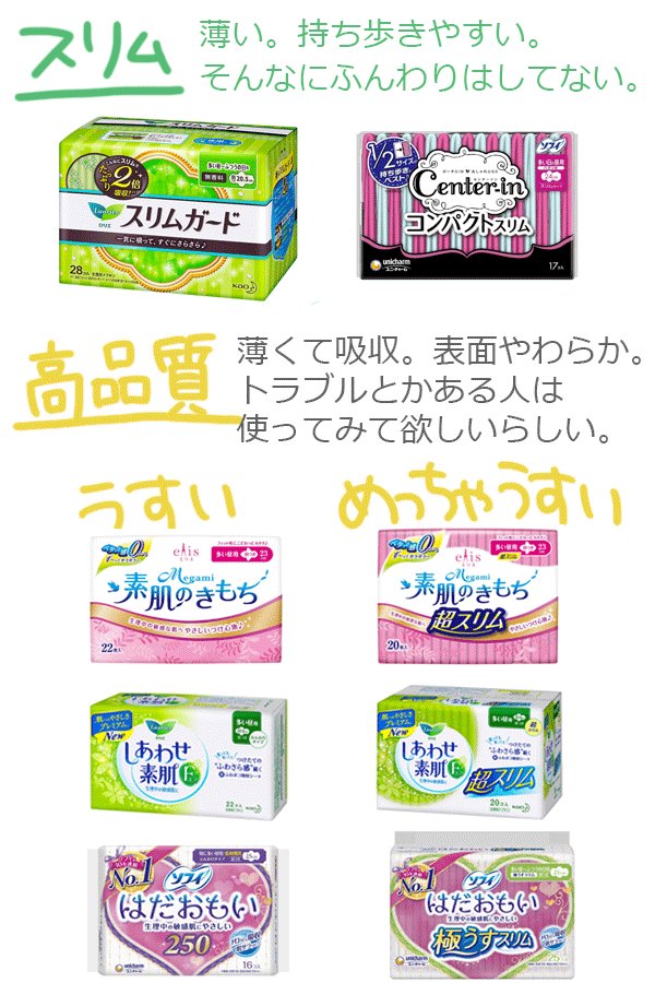 最近生理用品関連のツイートよく見るので、メーカー勤務の友達に何がいいのか聞いたら特徴あっておもしろかった。基本的には高品質のとこが肌に優しく吸収よくて薄いのだとか。生理用品て皆話題にしないけどぜひおすすめしあっていいの見つけて欲しいとのこと。あと生理重い人はとりあえず病院行って。