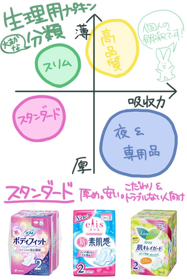 個人的な感想こみこみだし、うちのフォロワーさん女子少ないけどリプ欄にオススメ書いときます!月1回とはいえ、快適に過ごせるように情報交換したいな! #生理用品