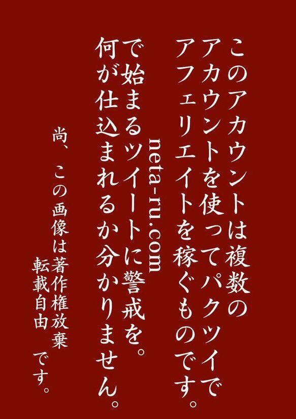 引用したアカウントはアフェリエイトサイトに誘導するパクツイbotです。類似アカウントが多数存在するのでお気をつけ下さい https://t.co/jVpGVIwVdC