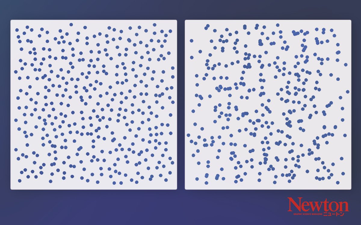 “科学雑誌Newton(ニュートン)公式さんのツイート: “二つの図のうち「ランダムな点の分布」はどちら? こう聞かれて,「左」と答える人もいるでしょう。実際は「右」がランダムな点の分”