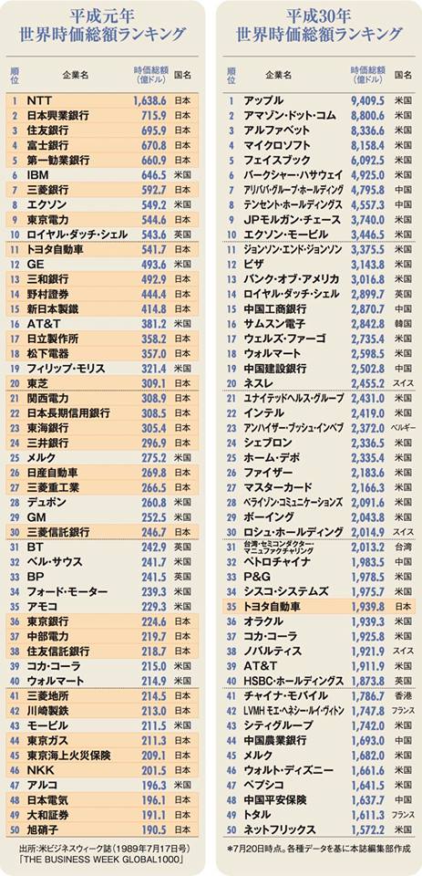 時価総額ランキング、順位じゃなくて時価総額の数値を見ると、日本が後退したというより、世界の富が一極集中し続けてきたことの表れな気がする。私は二極化は加速し続けるだろう派なので、今から30年後にはアップルがランク外になるほど富が集中した企業が誕生してる気がする。