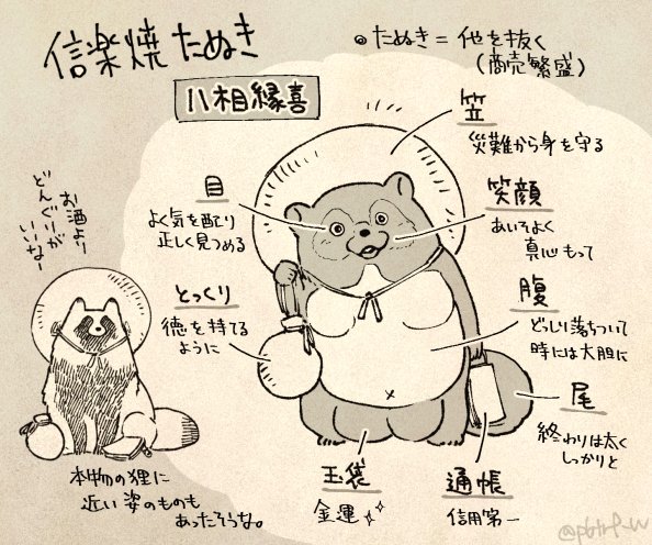 RT @tanuki_keio: 信楽タヌキと「八」という数字は結びつきが強いです! 徳利に「八」と書かれているタヌキも多いですね。その理由はハチムジナから来ているだとか、徳川家の家紋からだとか諸説ありますが、現在も滋賀県信楽町の「信楽たぬきの日」は11月の「8」日に行われてい…