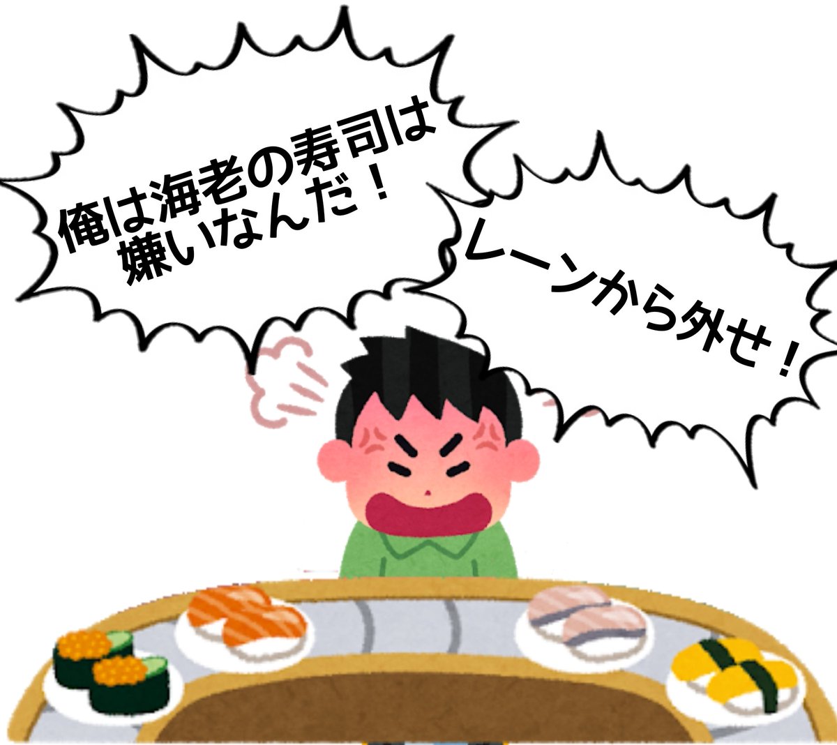 これの別パターンである「俺は甲殻類アレルギーだからエビをレーンから外せ」は何故か通ってる不思議 https://t.co/przuO3o1gb