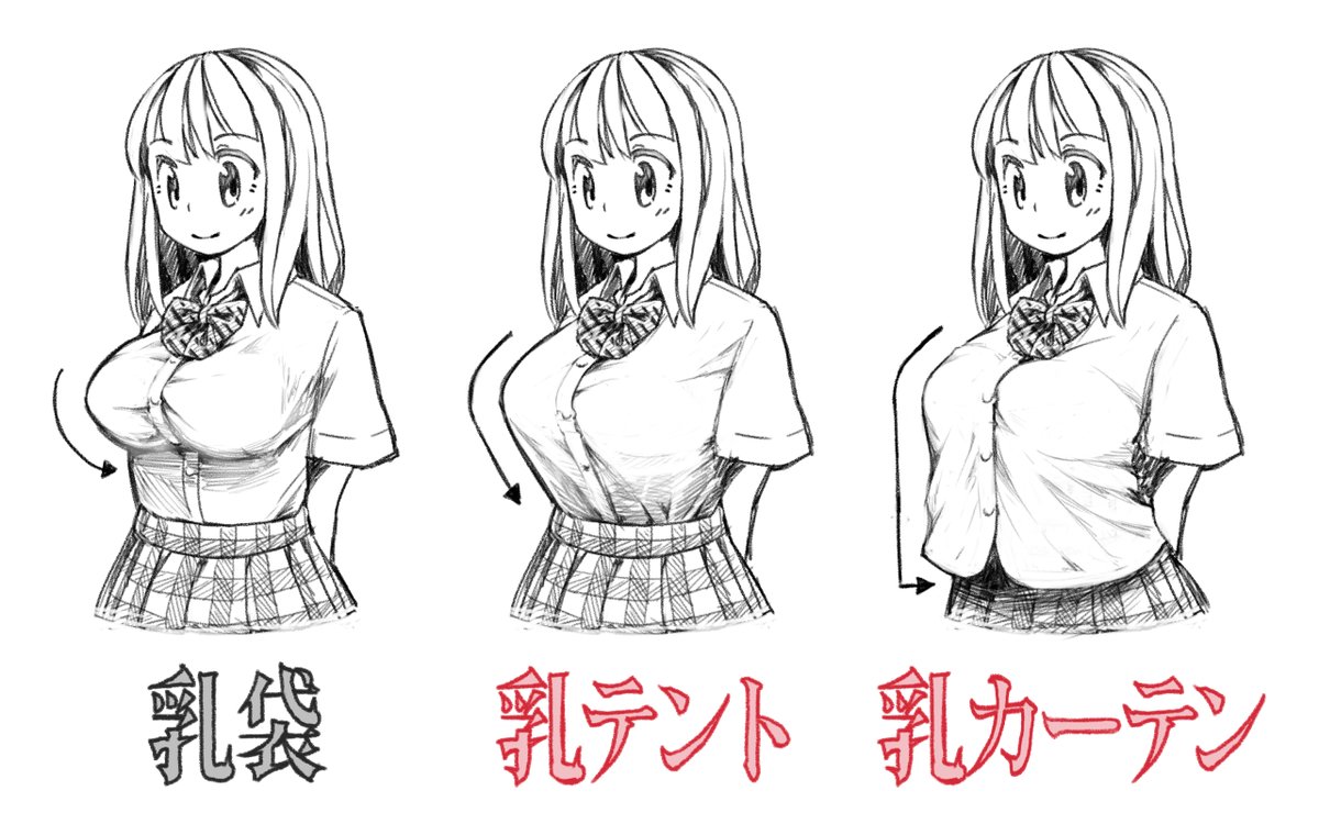乳テントと乳カーテンはリアルにありえる絵だけど乳袋は、どういう布地を使っているんだろう、縫製はどうなってるんだ? という疑問しかわかない。