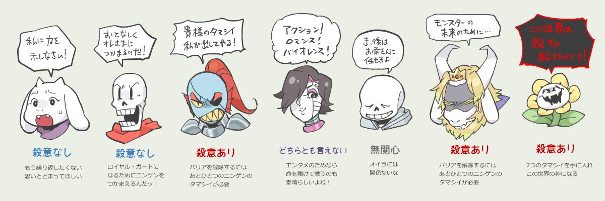 RT @J1N1_R: これ前から言ってるんですけど、『Undertale』ってのはそんな優しい話でなく、客観的に考えるとFloweyは言うまでもなく、UndyneやAsgore、Alphysも割とクソ野郎なんすよ。彼らは決して善良な存在でなく、明らかに倒されるべき敵。それを「…