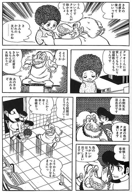 ブラックジャックの顔の傷と色違いの皮膚は幼い頃爆弾で吹き飛ばされて死にかけた時、混血児のタカシだけが皮膚を提供してくれたからよ。ブラックジャックはその友情に心から感謝してたし、タカシが死んだ後は形見になっちまったあの顔を大事にしてんのよ。美少女化だからって消して欲しくなかったよ。