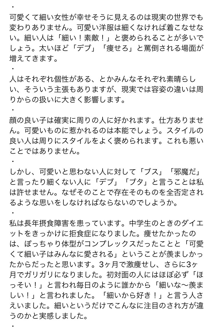 以前読んだ柚木麻子さんのButterも女性の容姿について描かれてた、その話を思い出した。その小説を読んでから痩せたら可愛いのにって考えをあまりしなくなった。