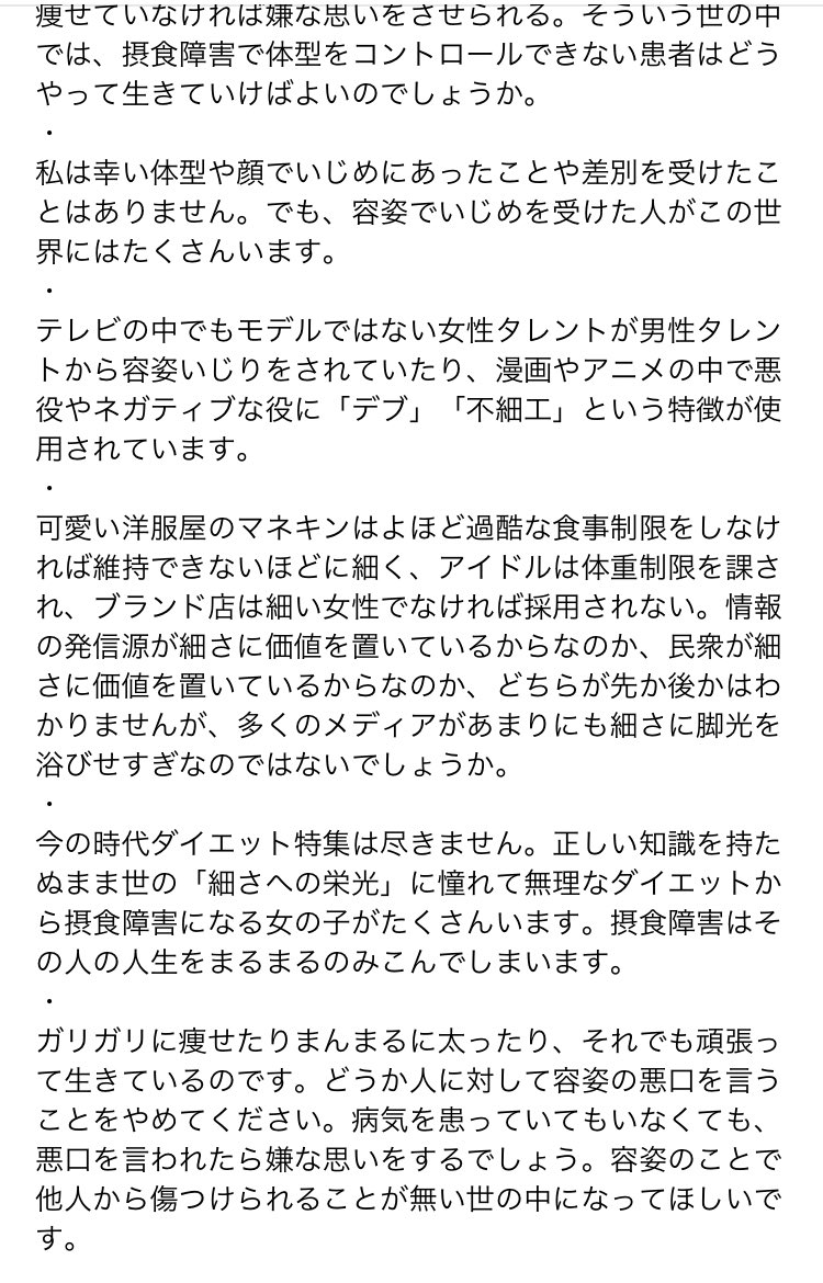 21歳の時にダイエットの反動で過食症になり8年。20代は過食に悩む日々だった。3週間で11kg太った時は人間こんなに太れるんだって驚いたよね。メディアの過剰で不確かなダイエット特集も女芸人さんのデブス弄りも観ててほんと胸糞悪い。芸人だろうが女性の外見で笑い取る文化そろそろやめよーや