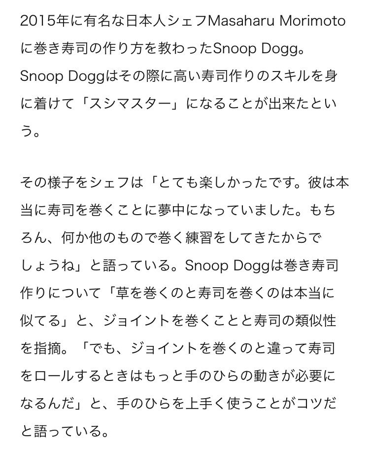 2018.10.21 ツイート maruSnoop Doggがマリファナ巻きすぎて、高度な巻き寿司が巻けるようになった話は笑った。 D-Movie®@DmovieDMSnoop Doggがマリファナ巻きすぎて、高度な巻き寿司が巻けるようになった話は笑った。 23:03 – 2018年10月21日返信リツイートお気に入り ツイートに対するネットの反応みしぇる↯@_michelle1これは”草”16:46 – 2018年10月22日返信リツイートお気に入りGALMxlmR-G3AR@GALMxLMRなるほど、未来のために巻き寿司作ろう15:57 – 2018年10月22日返信リツイートお気に入りランシャマー!(ま乙)@ran_ugxu草を巻くのとスシを巻くのは本当に似てる(名言)15:54 – 2018年10月22日返信リツイートお気に入りピザニートちゃん(-20点)@NEETchang草だけに草15:35 – 2018年10月22日返信リツイートお気に入りYASS-ABE@YasuAXT7471Snoop Dogg最高かよ(笑)(笑)(笑)(笑)15:33 – 2018年10月22日返信リツイートお気に入りtomoyuki@tomazooth微笑ましい :-)15:29 – 2018年10月22日返信リツイートお気に入りじゅんじゅん@junpei_euphシェフ 『 もりもと まさはる 』15:29 – 2018年10月22日返信リツイートお気に入り優斗@screamuto面白すぎるwヤバw15:24 – 2018年10月22日返信リツイートお気に入り ゴリラ親方@Gori_Zappa流石www15:13 – 2018年10月22日返信リツイートお気に入りマキト@emuke_tea吸ってみたいとは思わないけど、実際大麻・酒・タバコの依存度や危険性ってどうなんだろなあ。大麻ってのが縁遠いものだからわからん。14:55 – 2018年10月22日返信リツイートお気に入り夜カフェ ZiNNiA@tairamanp(笑)14:48 – 2018年10月22日返信リツイートお気に入り黒鴉@zrs_1032スヌープが巻いた寿司……食っても大丈夫かな(笑)?14:41 – 2018年10月22日返信リツイートお気に入り終わらない連休を謳う蛇行@itaintme83スヌープおじさんどんだけ葉っぱ好きなの…その技術寿司に応用してるって本当に何してるの…アンタはリリック書いてお皿回してナンボの商売してる人でしょ……12:17 – 2018年10月22日返信リツイートお気に入りてんだ葉子@tenda102文字通りの草で草w06:40 – 2018年10月22日返信リツイートお気に入りてぃんこ@11.20はYA@kothin4649シェフwwwww01:45 – 2018年10月22日返信リツイートお気に入り ニルヴァーナ『鍛道見習い』@MTB06NILNIL二頭の兄貴が好きそうなお話だったからRT23:33 – 2018年10月21日返信リツイートお気に入り