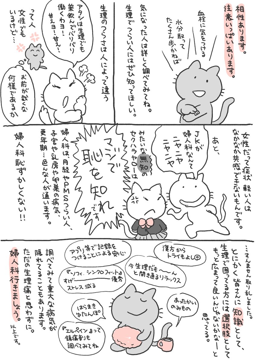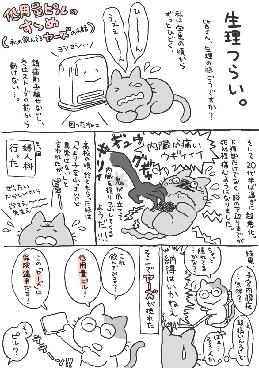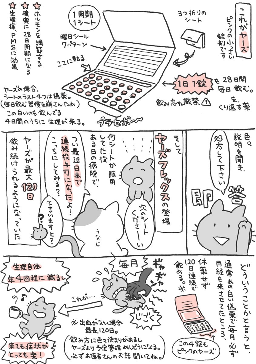 最近友達に聞かれて熱くプレゼンしたので、低用量ピル(私の飲んでる「ヤーズ」「ヤーズフレックス」)について描きました。気になった方は「調べる」「病院でよく説明を聞く」「納得」の上でトライしてみてください生理でつらい女性や周りの方へ知識・選択肢として広まってほしいです。