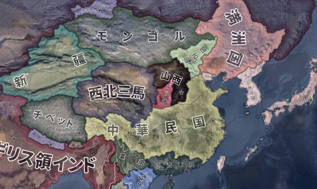 HOI4というスウェーデンの会社が作ったゲームでの1936年の排日(抗日)以前の東アジア勢力図。日本の教科書の内容とは全然違い複数の軍閥が混在しています。中共はゲーム会社に対し抗議しましたが、突っぱねられました。さぞかし中国共産党にとって都合が悪いでしょうねえ。