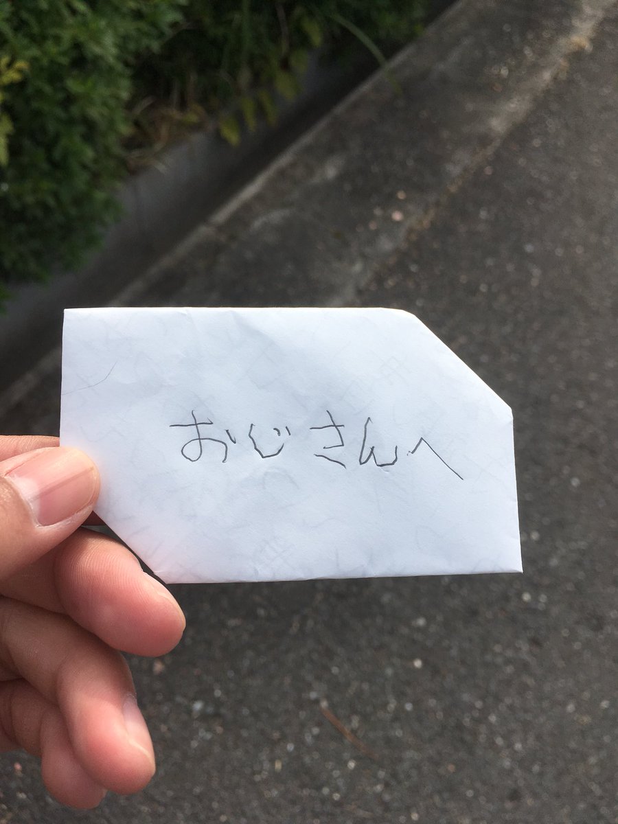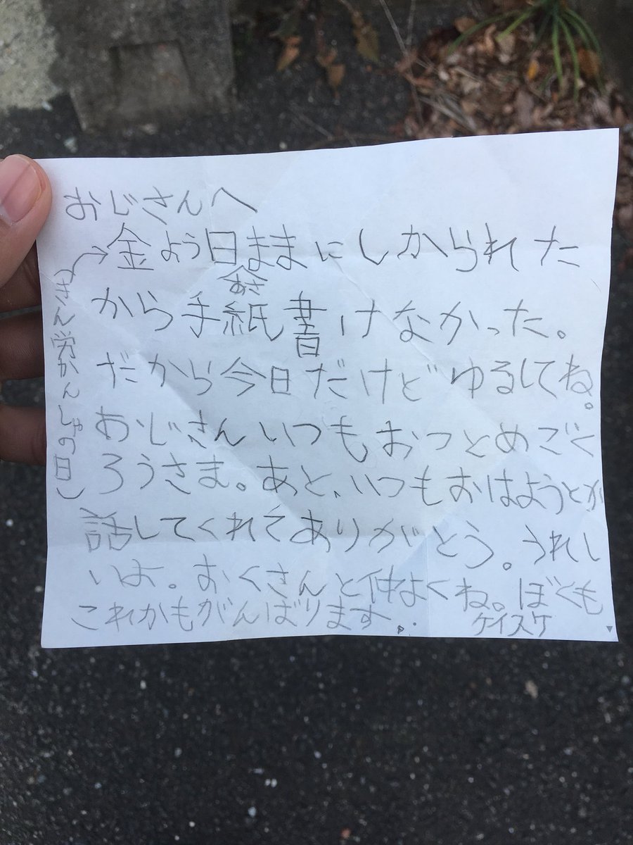職場近くの小学校の男の子からもらいました。これまでお互い名前は知らないのですが挨拶したりたまに話したりするような仲でした。おじさん嬉しくて泣きそうです。