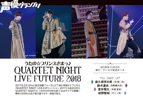 12月10日(月)発売の声優グランプリ1月号に、森久保祥太郎さん、鈴木達央さん、蒼井翔太さん、前野智昭さんが出演した『QUARTET NIGHT LIVE FUTURE 2018』のスペシャルレポートを掲載! 写真は100点超、12ページの超大ボリュームです☆ #QUARTETNIGHT #utapri