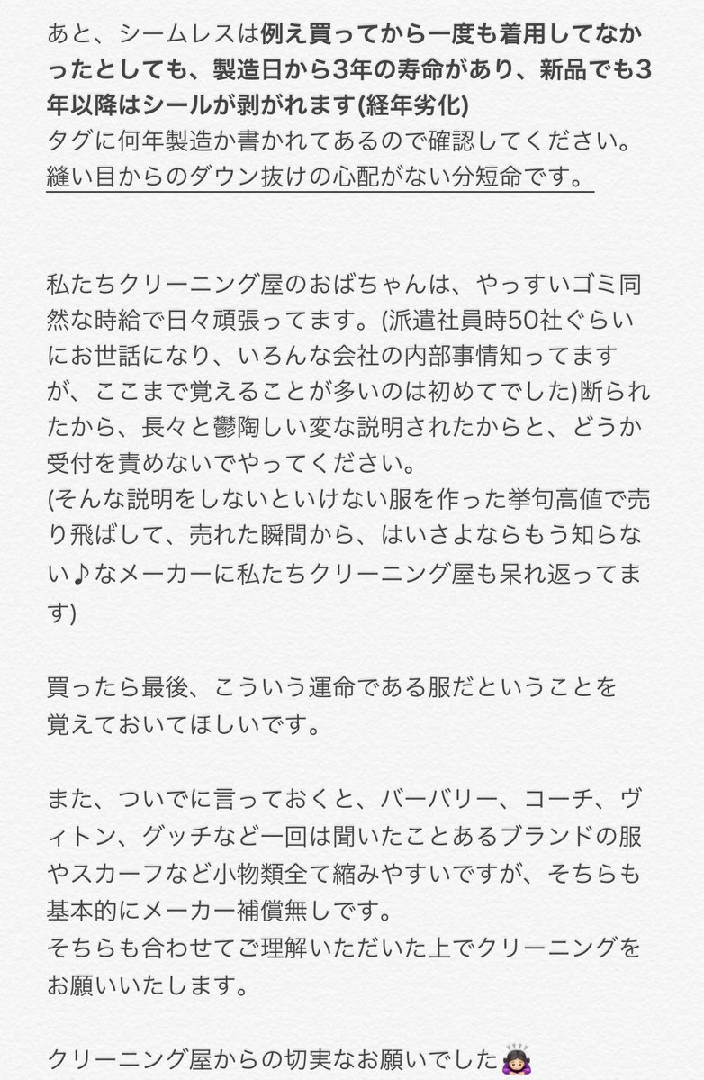 クリーニング受付で、散々説明をしてそれに了解して文句言いませんとフルネームでサイン頂いていてもクレームになる事案発生中。この際なのでお願いとして言わせていただきます。これを踏まえクレームいう前に一度考えて欲しいです。