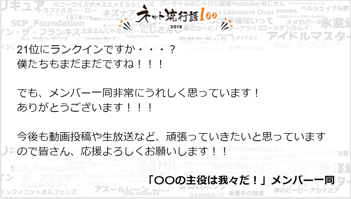 21位にランクインした「○○の主役は我々だ!」は主にゲーム実況動画を上げているグループです。