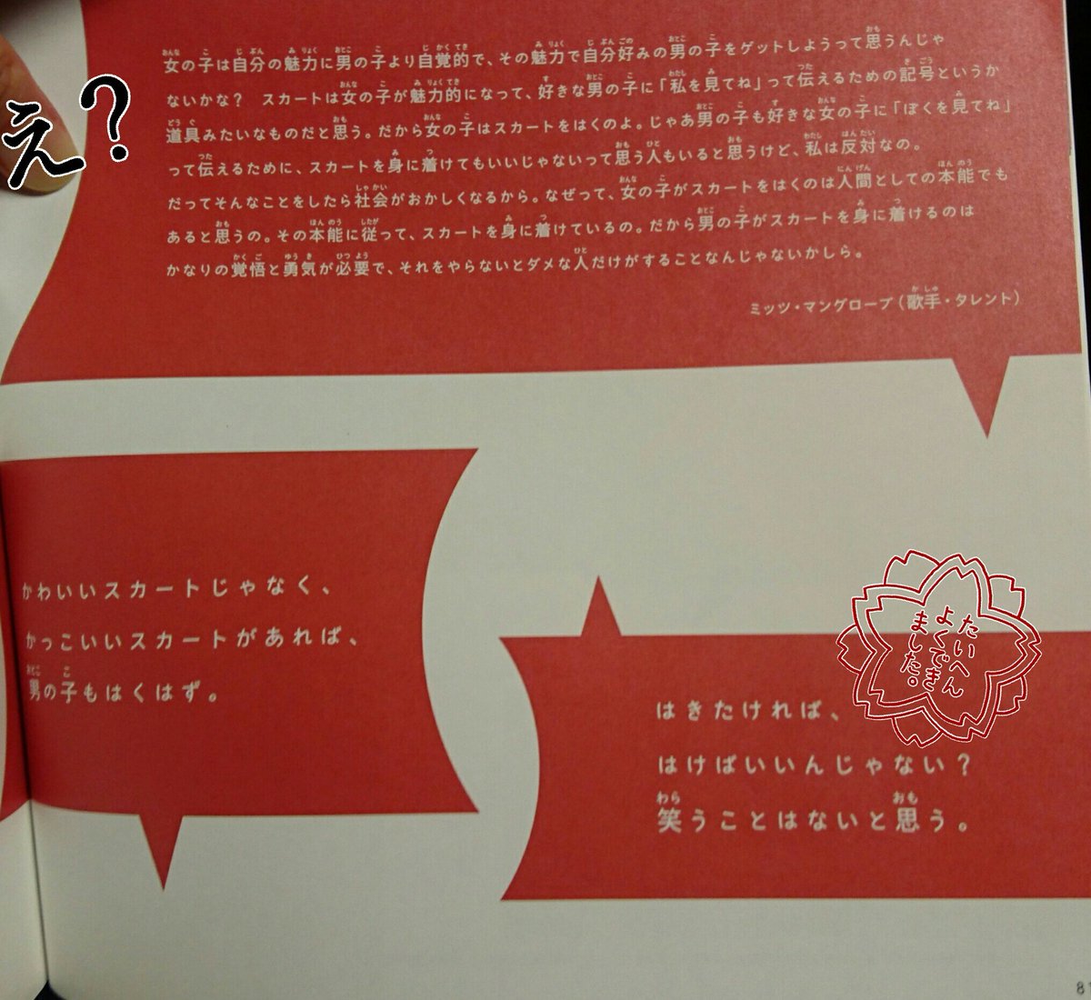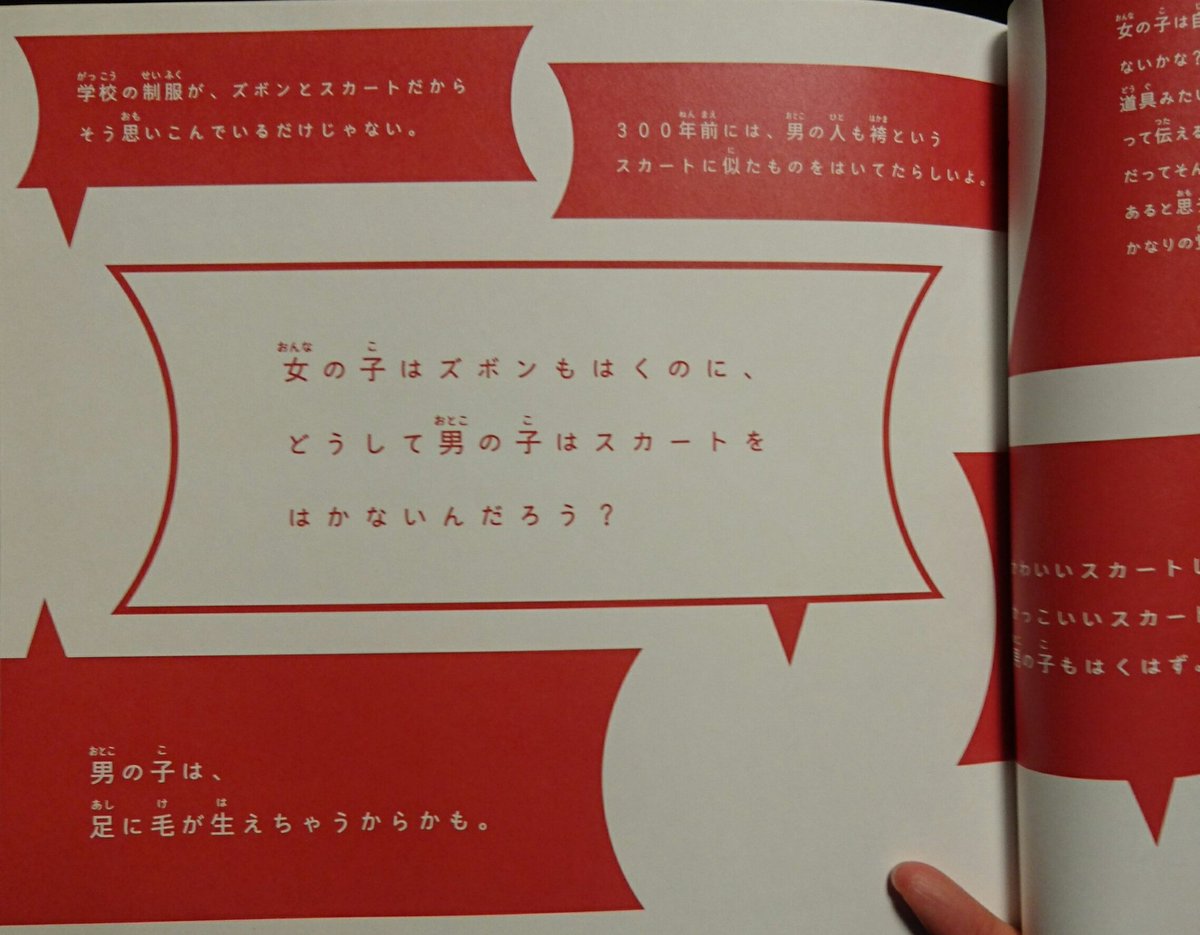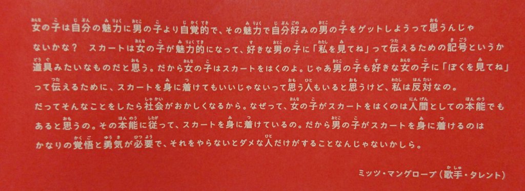 クソクソのクソだから見てくれ。某児童書だ。「女の子はズボンもはくのに、どうして男の子はスカートをはかないんだろう?」に対するミッツ・マングローブの答え「女の子がスカートをはくのは人間としての本能」