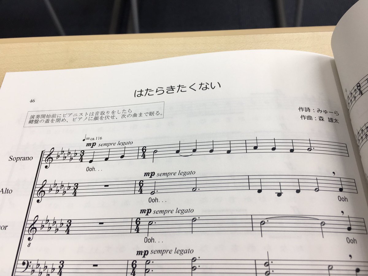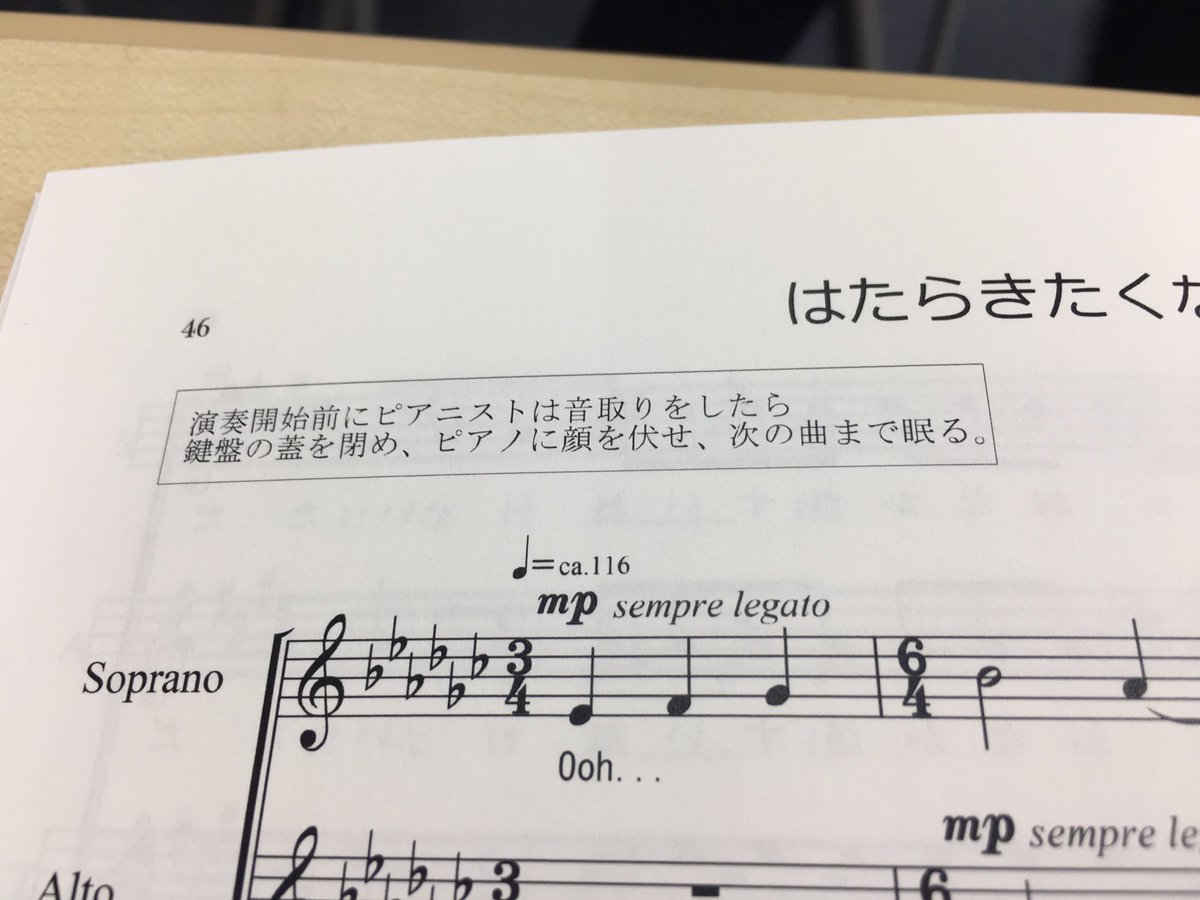 2018.12.23 ツイート maru楽譜。題名「はたらきたくない」。演奏開始前にピアニストは音取りをしたら、鍵盤の蓋を閉め、ピアノに顔を伏せ、次の曲まで眠る。 ポジティブ筑波@harp_flowntireこんなの初めて見た 17:51 – 2018年12月23日返信リツイートお気に入り ツイートに対するネットの反応ほい@mutontyaku0506好きだなぁ・・・。15:22 – 2018年12月28日返信リツイートお気に入り森 雄太@ta_mori_yuh㊗️2万ふぁぼ㊗️15:04 – 2018年12月28日返信リツイートお気に入りmoco@moco31068427なんていうかまさにこれ 残業つらー22:11 – 2018年12月27日返信リツイートお気に入り森 雄太@ta_mori_yuhついに1万RT!ヽ( *・ω・)ノ12:22 – 2018年12月27日返信リツイートお気に入り小坂ゆうと@yut_o_kTLに流れてたけどふざけすぎww09:21 – 2018年12月27日返信リツイートお気に入り風のかたち/イセリアルウィンド(KLT)@EtherealWind493難易度高(うちのエレピには蓋がない) #はたらきたくない08:20 – 2018年12月27日返信リツイートお気に入り鳴子ゲイトウェイ@narkotyka変ホ短調とか音取りしたくない06:50 – 2018年12月27日返信リツイートお気に入りスマホしょっちゅう替える君@xyz9071働きたくない(^_-)22:34 – 2018年12月26日返信リツイートお気に入り 太鼓打@Taico_Uchi危険すぎる。解釈によってはこの曲をアンコールで演奏してしまった場合、その後一生ピアニストが寝たきりになる可能性がある。ピアニストへの指示は「この曲の演奏が終わるまで」に変更するべき。21:04 – 2018年12月26日返信リツイートお気に入りウッディ@lotteicthこんなん作詞・作曲はこいつに決まってるだろ! @oreranoyuzo18:29 – 2018年12月26日返信リツイートお気に入り蒼色@MacroscopicBlue来年の合唱曲は是非これで。15:26 – 2018年12月26日返信リツイートお気に入りよいちゃー@airia303ピアニスト眠っていいの⁈笑14:18 – 2018年12月26日返信リツイートお気に入りbamchoh2@bamchoh2音楽って奥が深い12:34 – 2018年12月26日返信リツイートお気に入り沙蘭ザール@Julie4hogwartsやってみたーい笑09:53 – 2018年12月26日返信リツイートお気に入り東改@azumakai57もう4分33秒(ジョンケージ)でよくね?09:40 – 2018年12月26日返信リツイートお気に入り 抹茶/Matcha@MatchaRyokucha✨ 別な演技力が問われる〜!09:38 – 2018年12月26日返信リツイートお気に入りとろぽい シュバツ =͟͟͞͞ ( ˙꒳˙)@Piyo_poiここまでバズってるのすごいわ (彼のアイコンは私が描きました宣伝)09:20 – 2018年12月26日返信リツイートお気に入りyukie@yukie_sd「はたらかないで暮らしたい」を上回る曲かもしれない08:06 – 2018年12月26日返信リツイートお気に入り秋那涼@akina__ryo_suzuこういうの観ると改めて 表現の自由 の真意を思い出しますね01:40 – 2018年12月26日返信リツイートお気に入りふーみん@DRhuD6nanJ3BzC8色んな音楽しってるが(パーカッションがティンパニね突っ込んで上半身うまるとか)こっち方向は初めて… 斬新すぎるだろ22:48 – 2018年12月25日返信リツイートお気に入りSHINGO@ConSenT+pluG@no_shingoこんな♭多くてテンポ116で 音符少なかったら サタニックか?(笑)21:56 – 2018年12月25日返信リツイートお気に入りたかす@un85bmq合唱のピア伴経験者としては、これは楽なのか、逆に注目を浴び緊張するのかわからない。21:38 – 2018年12月25日返信リツイートお気に入り ゆうき@才谷屋メリクリアケオメコトヨロ@Yuuki_Saitaniya演奏は「見せる(観せる)もの」でもあるからこういうのもアリアリ。20:30 – 2018年12月25日返信リツイートお気に入りゆういち@yuicdwblこれ次回のファンミでやろ!18:40 – 2018年12月25日返信リツイートお気に入りピコたそ@ELEPHANT_GEARオレが登場する時のBGMに決定。18:09 – 2018年12月25日返信リツイートお気に入り冴@kohone_classic確かに初めて見た(笑)。17:50 – 2018年12月25日返信リツイートお気に入り貧超@お空の大戦勢@bincho0510ワロタ16:55 – 2018年12月25日返信リツイートお気に入り狂歌てゃん/とあ子。@_kyoka_0110_これのピアニストならしても良いな()16:51 – 2018年12月25日返信リツイートお気に入り氷河 火露也@Hiro_Hyoga何じゃこりゃあ!! 真面目に演奏の指示として書かれてるのがおもしろい。16:45 – 2018年12月25日返信リツイートお気に入りかのん。@kanonkohataめっちゃ弾けるわけ笑笑16:27 – 2018年12月25日返信リツイートお気に入り夏庭囲鶴斎@tamakinsniper四分十三秒は芸術だが、これはメッセージ。16:25 – 2018年12月25日返信リツイートお気に入りぱる 12/28-31CDJ@daily_orange打首獄門同好会に先立ってこんな曲があったとは!16:19 – 2018年12月25日返信リツイートお気に入りおあや@87_johnimateこれ現代のジョン・ケージなのでは16:07 – 2018年12月25日返信リツイートお気に入りなんでもつくるレイ@reibodoge森姓は、働きたくないことを主張する伝道師か何かなんだろうか。 ピアノソナタ変ホ短調はたらきたくない ってところか?13:11 – 2018年12月25日返信リツイートお気に入りおにぎりくん@onigirist_0124おい13:08 – 2018年12月25日返信リツイートお気に入り友野@tomonosdnそわっ…笑12:43 – 2018年12月25日返信リツイートお気に入り翔瑚@syoko_0412ワロタww12:19 – 2018年12月25日返