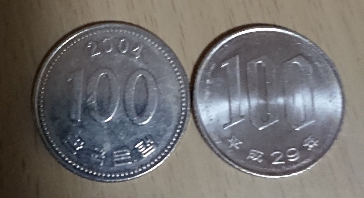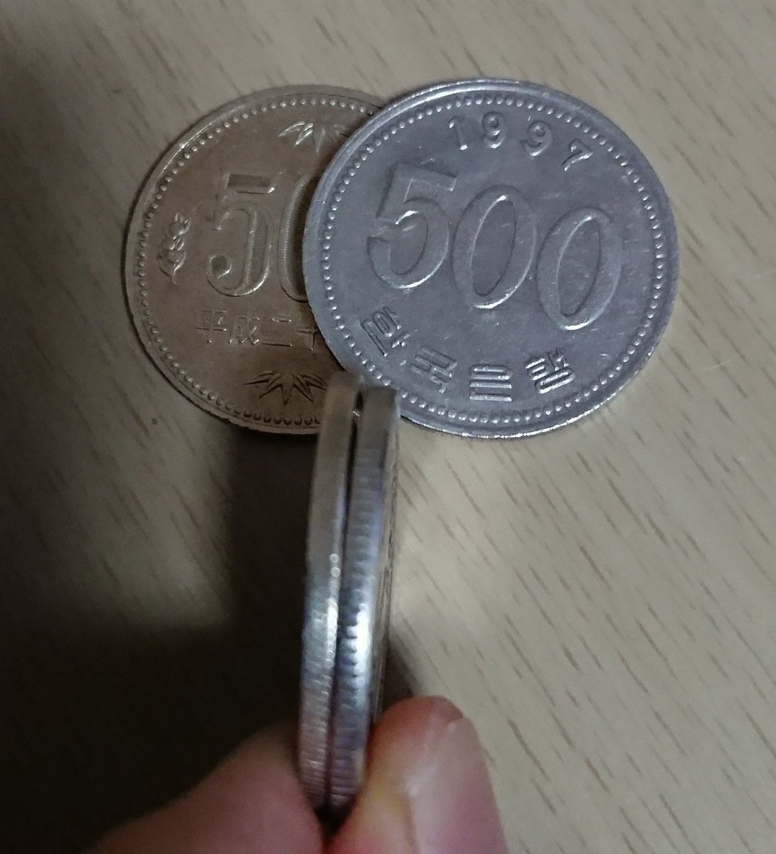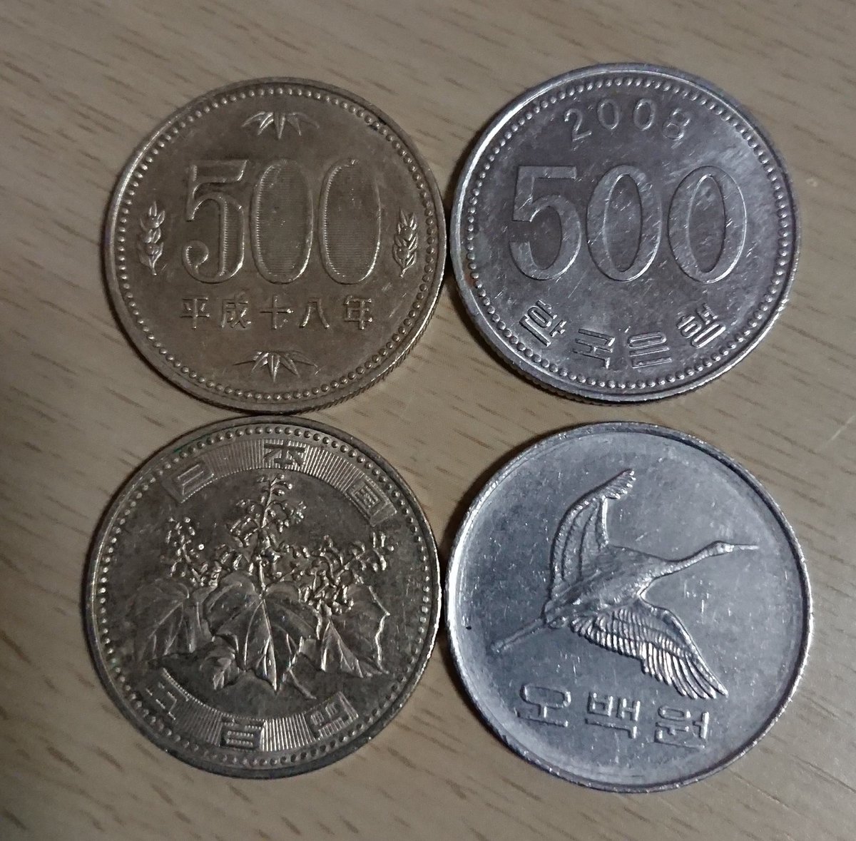 日本500円硬貨と韓国500ウォン硬貨(日本円で大体50円)がそっくりなんや