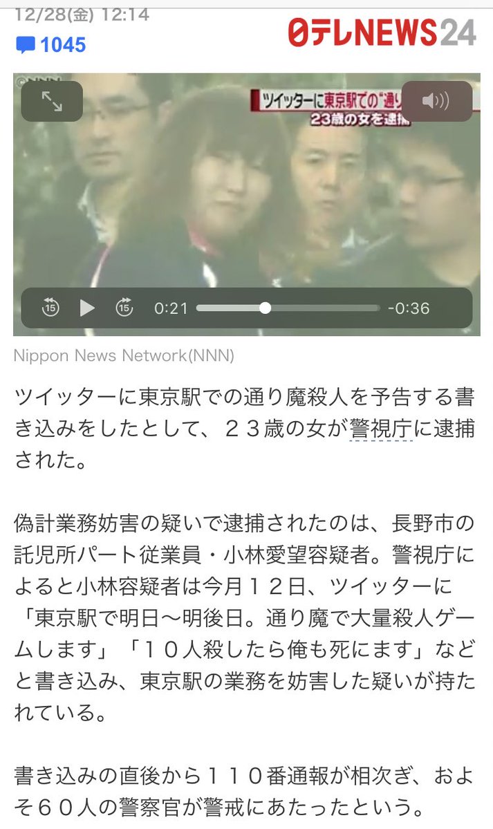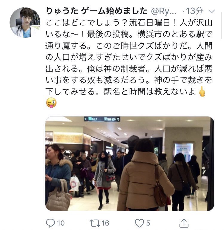 2018.12.28 ツイート maru【朗報】医大生を装ってたバカッター、ついに逮捕されるw w w 龍神@ファボ規制@kiritoninatta【朗報】医大生を装ってたバカッター、ついに逮捕されるw w w 23:33 – 2018年12月28日返信リツイートお気に入り ツイートに対するネットの反応05式消音短機関銃bot@05SubmachineGunざまぁないナリww02:56 – 2018年12月29日返信リツイートお気に入りゆーた⸜(* ॑ ॑* )⸝@yuta_s68逮捕されたのってこのツイートの奴じゃなくね? 「10人殺したら」の下りないじゃん02:55 – 2018年12月29日返信リツイートお気に入りと・*てノミ@totedragonほい、この前の殺人予告の馬鹿捕まったらしいぞ02:54 – 2018年12月29日返信リツイートお気に入り佐藤渉@1017_wataru_龍神のお陰で草01:34 – 2018年12月29日返信リツイートお気に入り☆Drizzle☆/ゲーム・絵とか用@Tokiki923XXニュースでは東京駅だけど ツイッターは横浜市なんだよな…01:08 – 2018年12月29日返信リツイートお気に入りふわきつね@fuwafuwa_syun女だったんだ… てか本当に23歳?00:42 – 2018年12月29日返信リツイートお気に入り都舞薇❥❥つぅ。自発中#相互@Dylanguitarzoneまさかの笑00:41 – 2018年12月29日返信リツイートお気に入りイキリト@龍神は神@8strong_strong8やっぱり龍神は社会的にも神だった00:32 – 2018年12月29日返信リツイートお気に入り ❄おふぐっち〘+α〙@ちょまま神教@ofuguxtucchi横浜市のとある駅って言ってるのに逮捕されたときのニュースはは東京駅って00:19 – 2018年12月29日返信リツイートお気に入り腹ぺこゆま虫@18歳免許取るまでにBCNR33買うぞ!()@yumamatti今回はマジで龍神は良くやったと思う00:12 – 2018年12月29日返信リツイートお気に入りないんあるぷぁ⌬ ✰҉҈҉҈҉҈@yan_hps女だったのか23:59 – 2018年12月28日返信リツイートお気に入りはしびろ@LoveFighters@Hashibiro99女だったのか…23:57 – 2018年12月28日返信リツイートお気に入り覚醒ともっち@inori_orenoyome女性で更に草23:56 – 2018年12月28日返信リツイートお気に入りり か@Euphoria_rkりゅうたって人のアイコン SHINeeのミノなんだけど こんな人に写真使われて可哀想まじで23:47 – 2018年12月28日返信リツイートお気に入りぽて者@poteja_pote女とか衝撃すぎる23:42 – 2018年12月28日返信リツイートお気に入り バナナ @尾北家 カバネリ乱@banana_877_0707いまこのツイート見てて流石やなって思ったらニュースでやっててビビった23:42 – 2018年12月28日返信リツイートお気に入りからいショートケーキフォロバ中@shidou824草23:39 – 2018年12月28日返信リツイートお気に入り佐野 義武@sanoyositake123やったぜ。23:36 – 2018年12月28日返信リツイートお気に入りダニぽ@UIFgBBUMehQvMhPこいつ自分が見つけた訳でもないのに なに自分が第一発見者みたいに振舞ってるんや きもいダニ23:35 – 2018年12月28日返信リツイートお気に入り