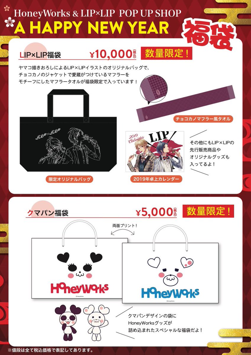 本日よりSHIBUYA109 B1にて『HoneyWorks & LIP×LIP POP UP SHOP~A Happy New Year~』オープン┗|∵|┓LIP×LIP福袋だけでなくクマパン福袋もご用意しております