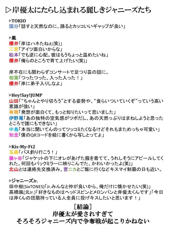 2019.01.02 ツイート maru2019年のジャニーズ界、血で血を洗う岸優太争奪戦が起こりそうで震えている。 ぽてこ@pote12242019年のジャニーズ界、 血で血を洗う岸優太争奪戦が起こりそうで震えている。 11:36 – 2019年01月02日返信リツイートお気に入り ツイートに対するネットの反応ぱっちょ@shnsk14だってよ、岸くん!16:51 – 2019年01月02日返信リツイートお気に入り✈️@IMifwa岸くん すごいな…16:43 – 2019年01月02日返信リツイートお気に入りyukko☆@yukko_0123颯くんトリに名前挙げられてる15:24 – 2019年01月02日返信リツイートお気に入りnon@ftftlyよく見ると、髙橋颯さんノミネートされてて笑った(笑)15:08 – 2019年01月02日返信リツイートお気に入りねんぴ@nenpidayon寂雷先生かと思ったらジャニーズの話だった15:03 – 2019年01月02日返信リツイートお気に入りにこ@nico_ino_0924岸君愛されすぎてて好きだなぁ、って思ったけど、知念くんのコメントでそれ全部吹っ飛んだ。15:02 – 2019年01月02日返信リツイートお気に入りむらさきまゆちん@ma2825yu岸とお友達になりたいです14:50 – 2019年01月02日返信リツイートお気に入りりゆえんよじゃり@hatoyojyariここに参戦はおろか名乗りをあげる事すら出来ていない後輩たちもいると思うと…罪深いな、岸優太14:38 – 2019年01月02日返信リツイートお気に入り あだむ☻@buenabischan岸優太争奪戦おもしろすぎるし、ぜひ自分も参加したい!!www14:25 – 2019年01月02日返信リツイートお気に入りふまぴーち__サマパラ恒例にして@Peach_rinpai自分が岸の立場になった恋愛ゲーム作って欲しいレベル14:01 – 2019年01月02日返信リツイートお気に入り岸 り な @RiNA_prince_KCニヤニヤがとまらない14:01 – 2019年01月02日返信リツイートお気に入りま み む ー@APPAREICHAN岸くんやっぱ神よ13:59 – 2019年01月02日返信リツイートお気に入り脳みそしぬ子@mosudeniteokureめちゃめちゃかわいい13:42 – 2019年01月02日返信リツイートお気に入りR♡@SZ5_kp_jrむしろ起こって欲しいくらい愛おしい13:31 – 2019年01月02日返信リツイートお気に入りめめ@Kaito_0403_m一周回って岸くんになりたい気持ち…13:17 – 2019年01月02日返信リツイートお気に入り Haru@harurun_szマウントを取るフェネックwww12:53 – 2019年01月02日返信リツイートお気に入り@kf2sm_1_5_s笑うwwwwwwwwwwwww12:50 – 2019年01月02日返信リツイートお気に入りママティアラ 岸担@meroponmama岸優太争奪戦、実況中継してもらえませんか?12:37 – 2019年01月02日返信リツイートお気に入り刈り・上げ子@hei_sei_jyanpu9心が温まりました。 自分が褒められてる気分12:35 – 2019年01月02日返信リツイートお気に入りなち@jurimaru_0615嫉妬心の強い永瀬廉さんと独占欲の塊の田中樹さんしんどすぎてこのエピソードの原点となる岸優太さんには土下座してもしきれない…12:15 – 2019年01月02日返信リツイートお気に入り
