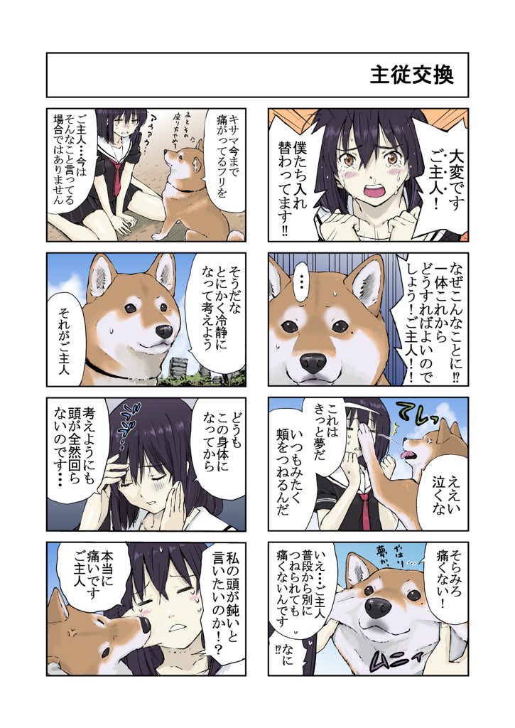 #世界の終わりに柴犬と #柴犬 #4コマ漫画世界の終わりに柴犬と 入れ替わる話 1・2