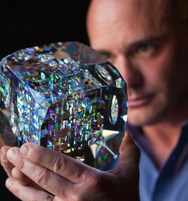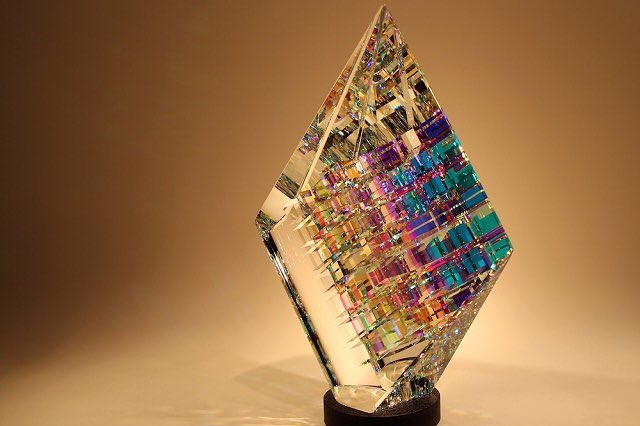 隣合った2つの数字の和をつなげて作られる数列「フィボナッチ比率」を用いたガラスのオブジェがすごく綺麗だ。ガラスをカット、研磨して組み立てるんだそう。何故その比率でこんなにもガラスが輝くのかは凡人の自分には分からない。幾何学模様に魅せられた繊細緻密なガラス作家。すごい。