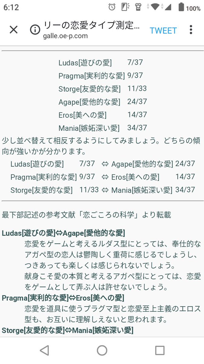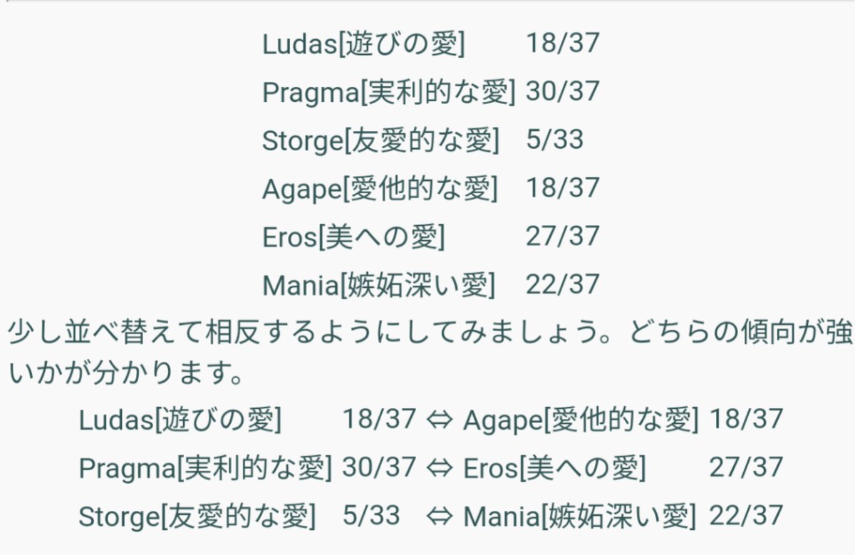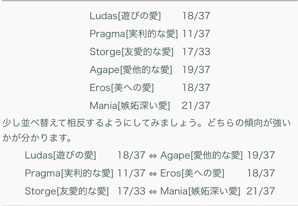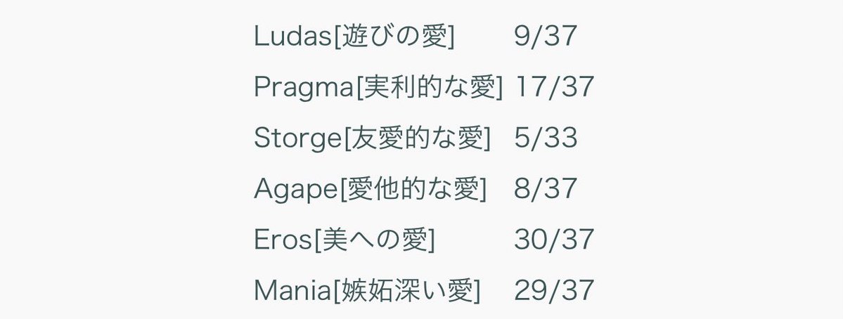 診断ではアガペが僅差で1番多く、次いでストルゲとマニアも出た でも自分が思うに顔面至上主義なのでエロスだとも思ったりもする 全くわからん