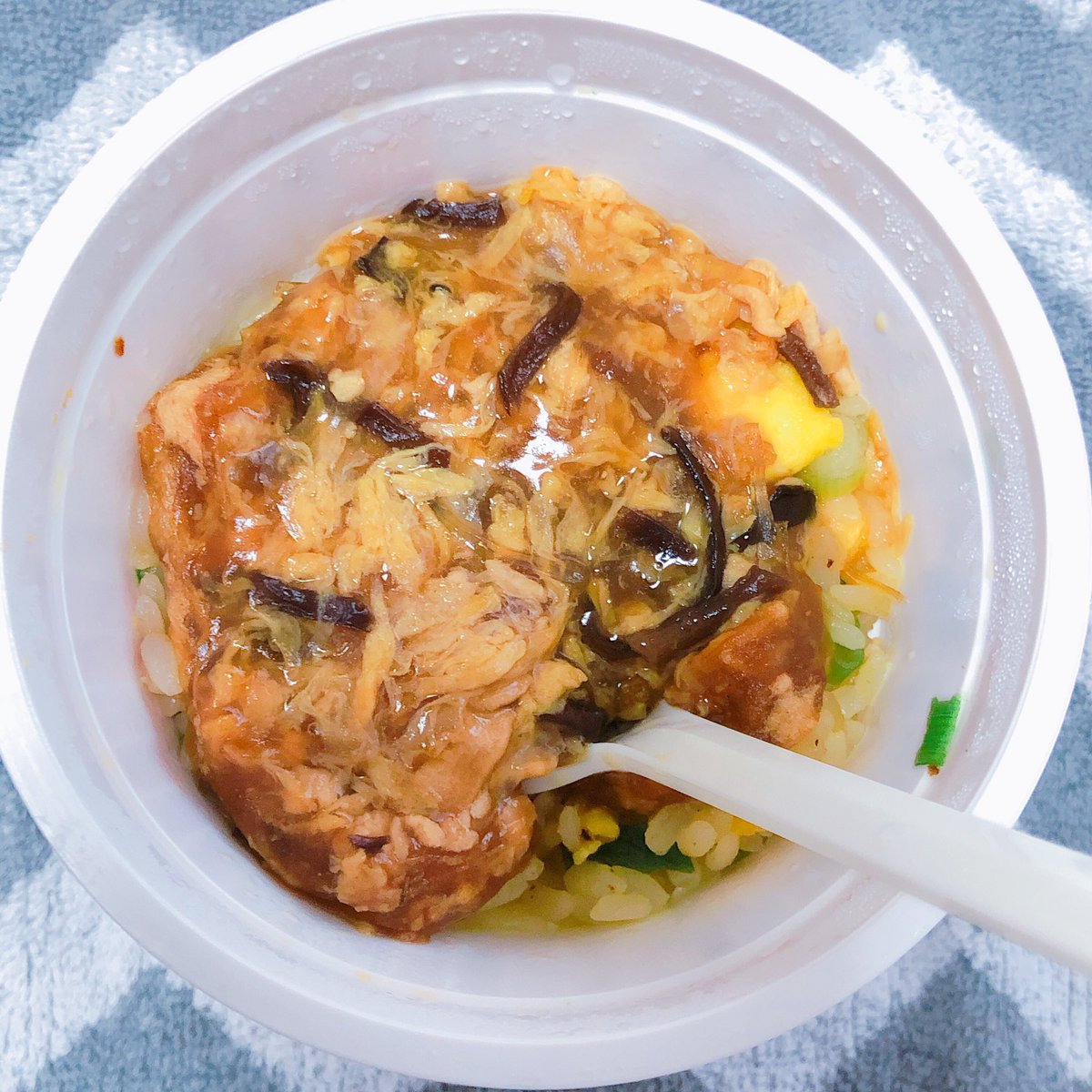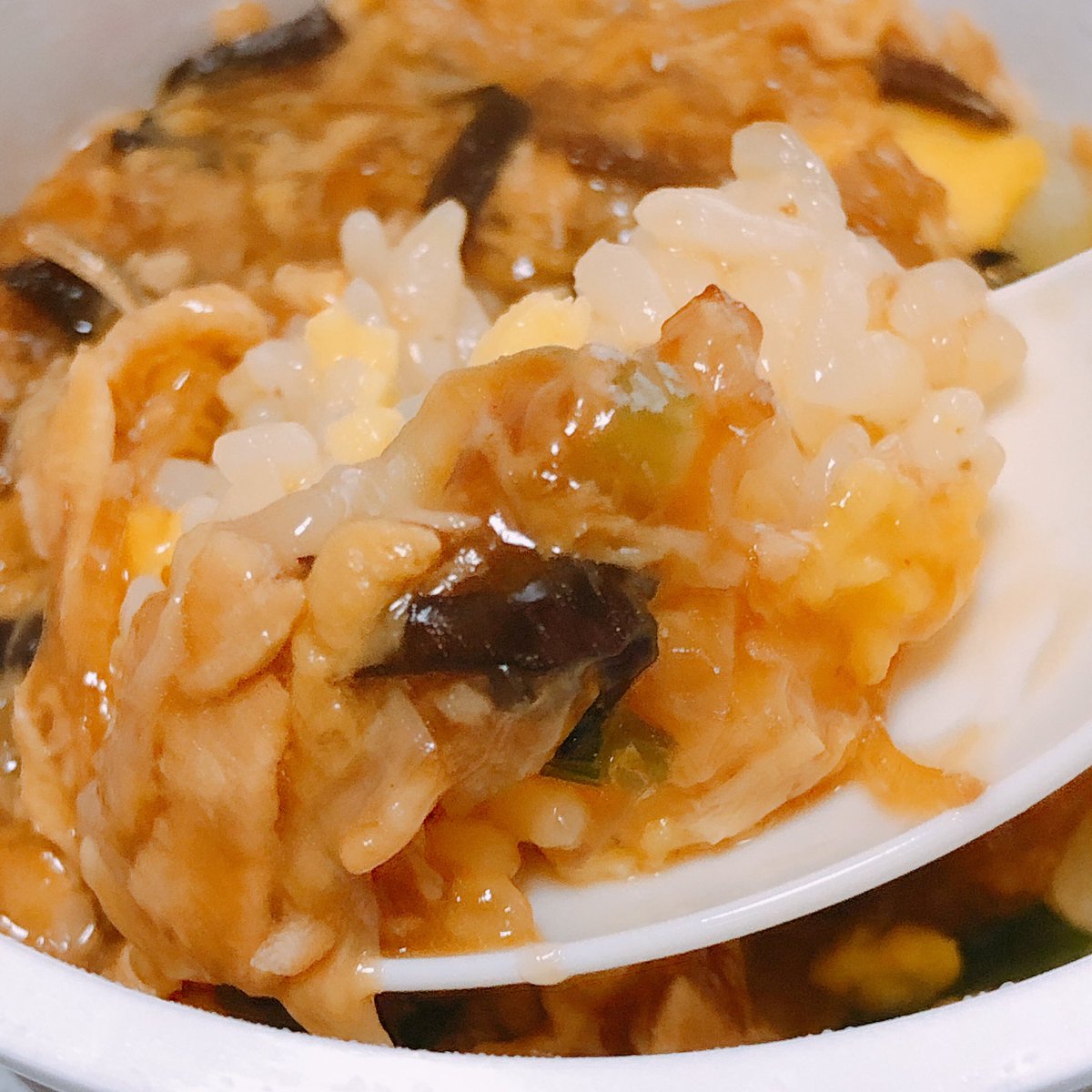 温めたカップチャーハンにフカヒレスープ乗せお湯100ccくらい入れるだけ!