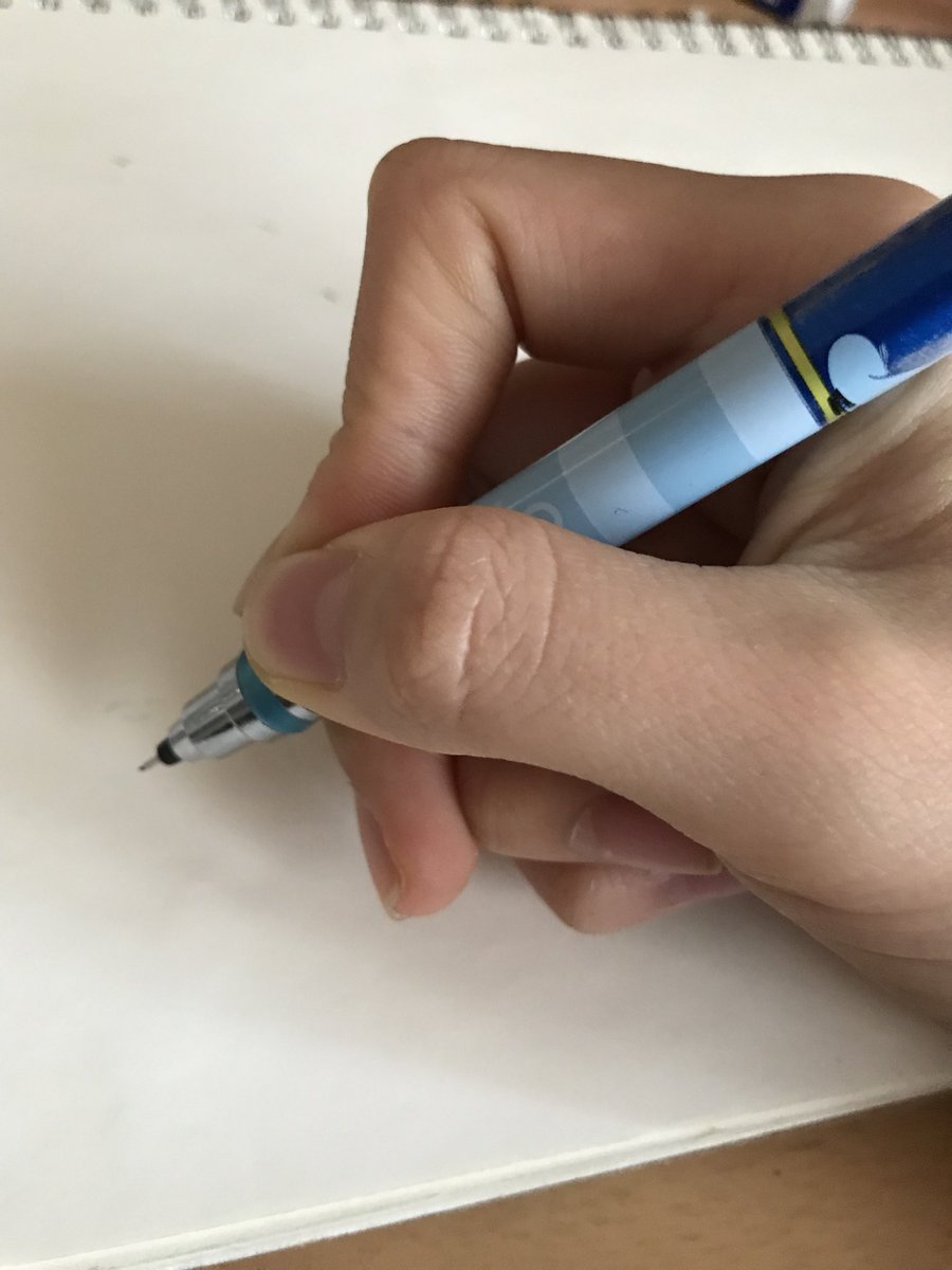 絵を描くどころか文字すらクッソ汚いけど、ペンの持ち方は「人差し指に親指がかぶさる」持ち方やな。
