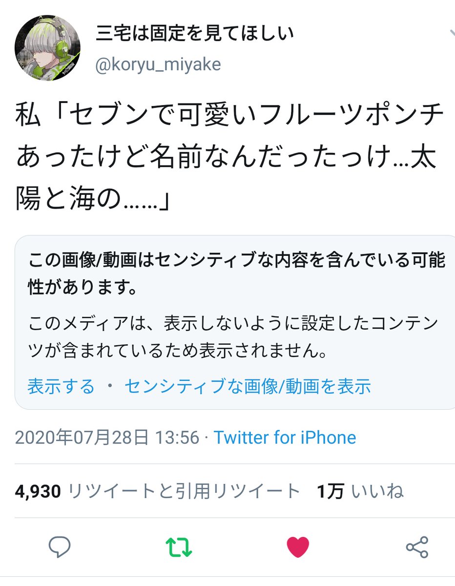 2020.07.28 ツイート maru私「セブンで可愛いフルーツポンチあったけど名前なんだったっけ…太陽と海の……」 三宅は固定を見てほしい@koryu_miyake私「セブンで可愛いフルーツポンチあったけど名前なんだったっけ…太陽と海の……」 13:56 – 2020年07月28日返信リツイートお気に入り ツイートに対するネットの反応🍓レウテス23🐾FFさん固ツイ把握( ˙ᵕ˙ 🙏🏼)@lukia_reutes23ん!美味しいやつです!14:37 – 2020年07月29日返信リツイートお気に入りまる໒꒱· ゚@Maruneko0141見た目可愛くて買ったけど これ美味しくなかった14:22 – 2020年07月29日返信リツイートお気に入りSztk.ter/すずっきー@Sztk_Kanoneちな美味しかったのでオススメ14:14 – 2020年07月29日返信リツイートお気に入り高野 苺@1/12移行作業中@nekounchisoujiシスコムーン13:12 – 2020年07月29日返信リツイートお気に入りがきこ🐶@gkk__0619なんか見覚えあるwwww13:04 – 2020年07月29日返信リツイートお気に入りT_WhiteStone in the DARKNESS@SSI0103私の心はだいぶ汚れているようだ。 商品名と違う物(というか情景?)が頭に浮かんでしまった。09:38 – 2020年07月29日返信リツイートお気に入りポニ男P@蘭飛志フ小=毒詞@wilkoponio昨日食べた09:37 – 2020年07月29日返信リツイートお気に入りのりたまは誤字多魔@tamakonyセンシティブらしいけど、なにかいやらしい言葉に見えたのかな?Twitterさん? https://t.co/TuP4gchVCS09:34 – 2020年07月29日返信リツイートお気に入り 久喜🌸審神者⇄無人島⇄寮生@CookeyTourabu電車の中でクソ噴いた09:09 – 2020年07月29日返信リツイートお気に入り死蟲@自粛だってよ@worm223wwwwwwww腹筋返してwwwwwwww08:44 – 2020年07月29日返信リツイートお気に入りお浜@kch5963稲中w08:33 – 2020年07月29日返信リツイートお気に入り水城(みずき)@Mizuki_K_ff14浮かれぽんちwwww07:06 – 2020年07月29日返信リツイートお気に入り新子@マスクはもう布でいいや@bashinko2020吹いたww03:48 – 2020年07月29日返信リツイートお気に入りはると@すーさん@Sousaku_Halto11面白かったので共有…01:09 – 2020年07月29日返信リツイートお気に入り川(✧∑✧ )川アマビエ捧ぐ荒(こう)-思考する欠片@joker_sburnめっちゃ久々にその単語を見たよ🤣🤣🤣00:38 – 2020年07月29日返信リツイートお気に入り 日常に生きるヒロシ@hiroshikaichoひひひひひ00:33 – 2020年07月29日返信リツイートお気に入りユーラー@勉強中@yuratosanめっちゃ気持ちわかるwwww wwww23:34 – 2020年07月28日返信リツイートお気に入り緋蓮@雑多@hiyokurenri688浮かれポンチは草23:11 – 2020年07月28日返信リツイートお気に入り怪文書を唐突に呟くbot@AshenmoorKw太陽と海とシスコムーンだろう23:04 – 2020年07月28日返信リツイートお気に入り安楽死@sinitaikillわろた22:42 – 2020年07月28日返信リツイートお気に入りさわ@A02ts笑いすぎてリアルにむせた22:40 – 2020年07月28日返信リツイートお気に入り