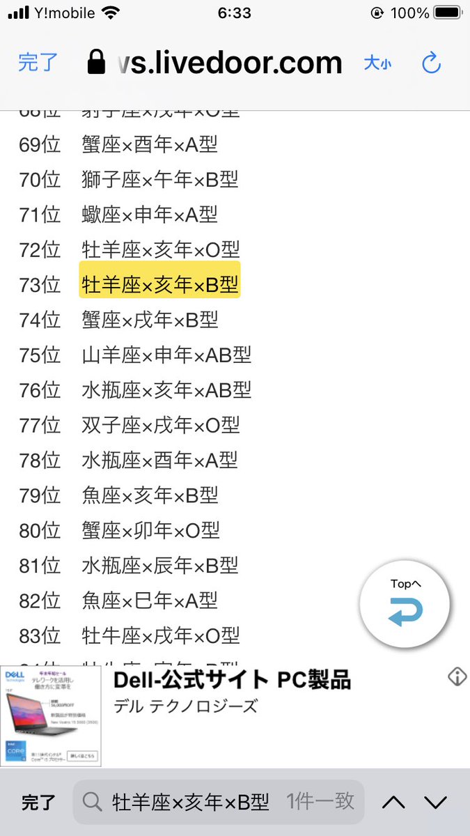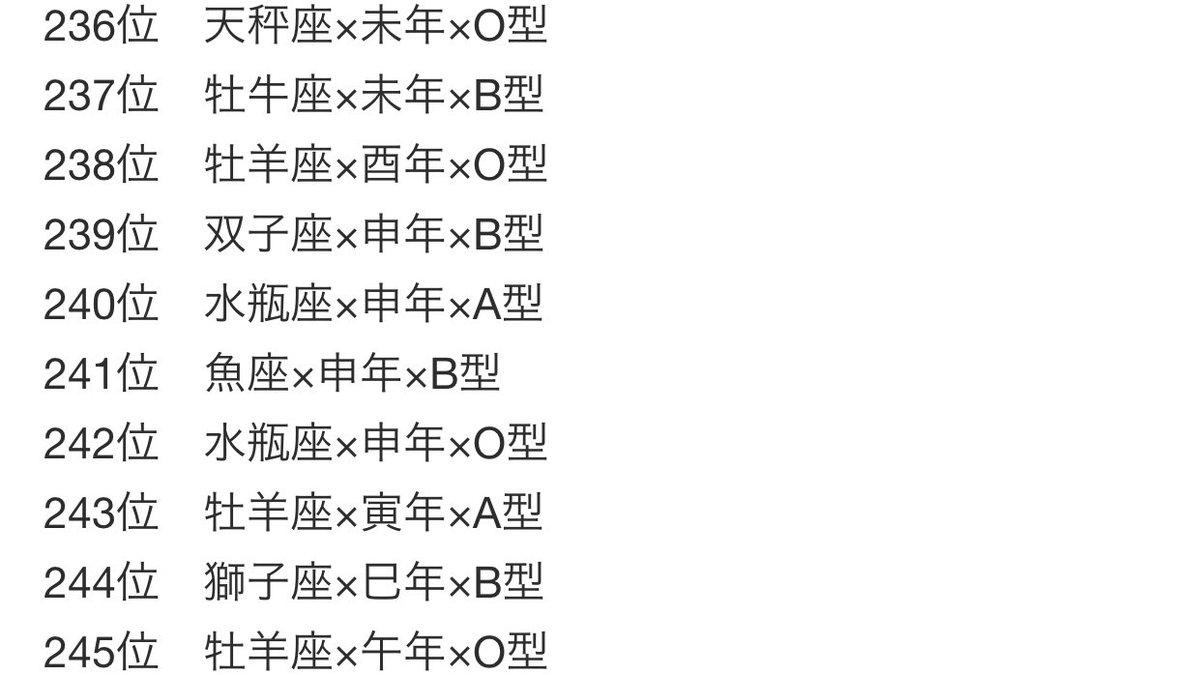 今年の1位は「水瓶座×亥年×O型」の組み合わせ。141位以降は、記事内に掲載されています。
