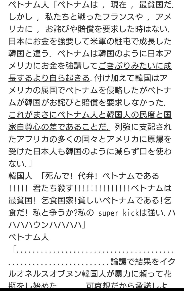 ベトナムが、韓国から「最貧国」呼ばわりされて、その反論がメチャクチャ、カッコイイ。「我々はフランス・アメリカ・中国と戦い独立したが賠償を要求した事はない。多額の賠償金と援助でぬくぬくと成長した韓国に言われる筋合いは無い。ベトナム人と韓国人の民度と国家自尊心の差だ。 」コレ6千RT